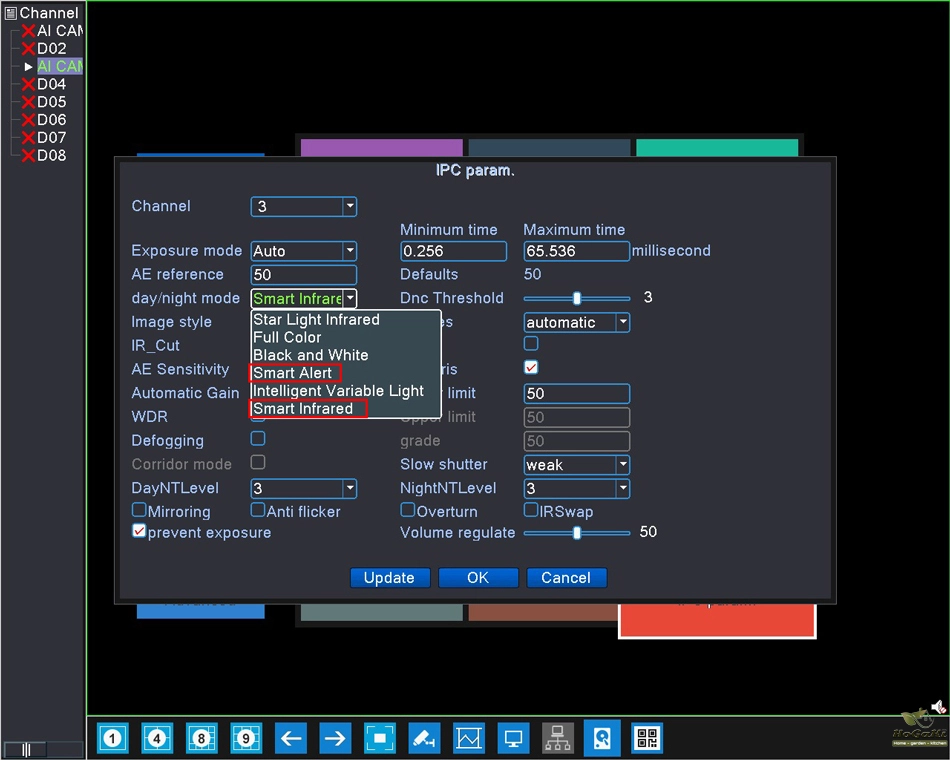 There only have 2 Option (other option don't work) : " Smart Alert " and "Smart Infrared " model