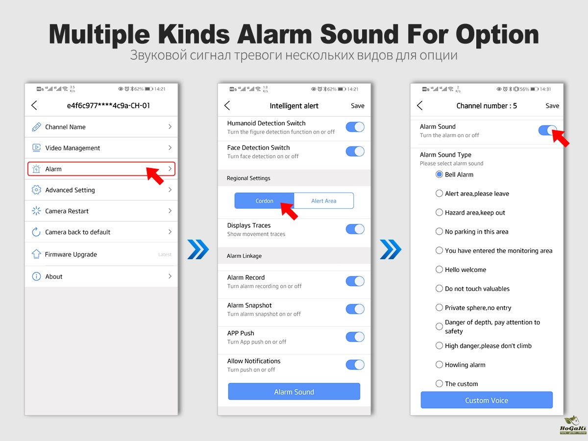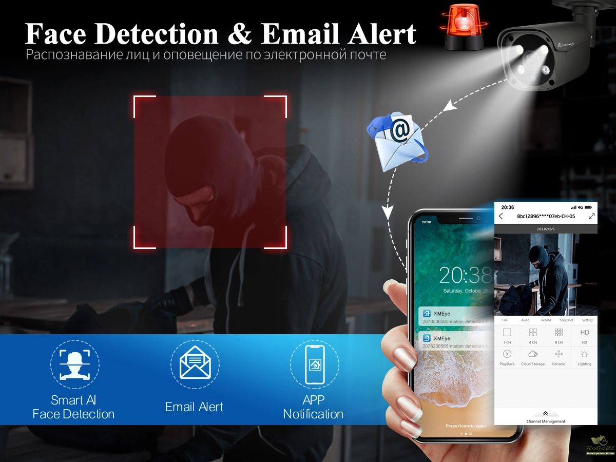 When someone breaks into shooting area, the camera will make alarm siren and alarm messages will be pushed to your Phone APP