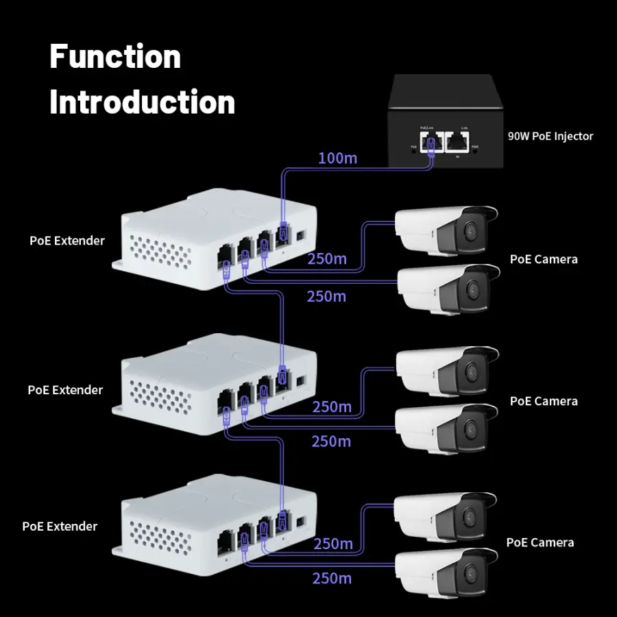 4.3-Port PoE extender can forward both Ethernet and PoE power for 1 terminal equipment via Cat5 ,Cat5e,Cat6,Cat6e,UTP cable.