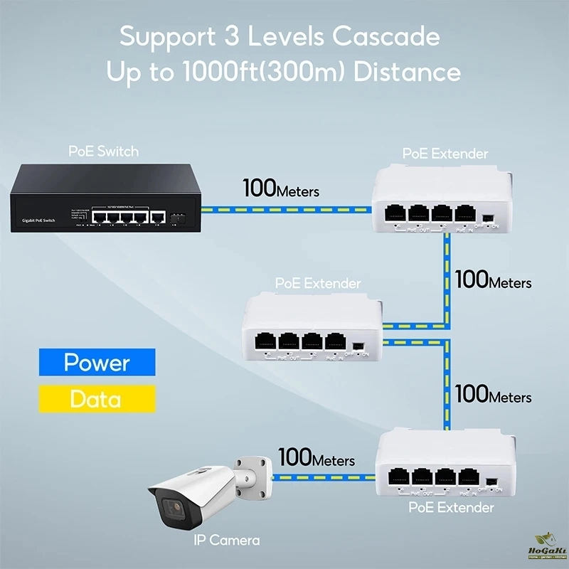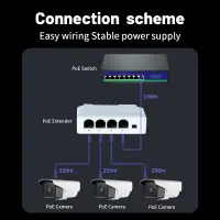 4.3-Port PoE extender can forward both Ethernet and PoE power for 1 terminal equipment via Cat5 ,Cat5e,Cat6,Cat6e,UTP cable.