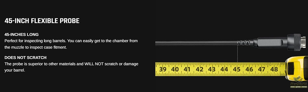 The boroscope has a small focal length of about 0.4 inches, which gives high-quality images illuminated by LED ring light. Moreover, it has 3 mirror with a side view to examine the walls of the barrel and the grooves and grooves of the trunk up close. The diameter of the boroscope is 5 mm, which is ideal for use on all barrel of .2 and larger calibers.