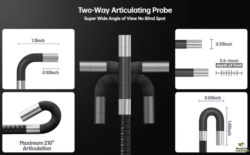 3.Articulating Probe: Navigate through tight spaces effortlessly thanks to the flexible and articulate probe. It bends and rotates, allowing you to access even the most challenging areas while maintaining crystal-clear visibility.