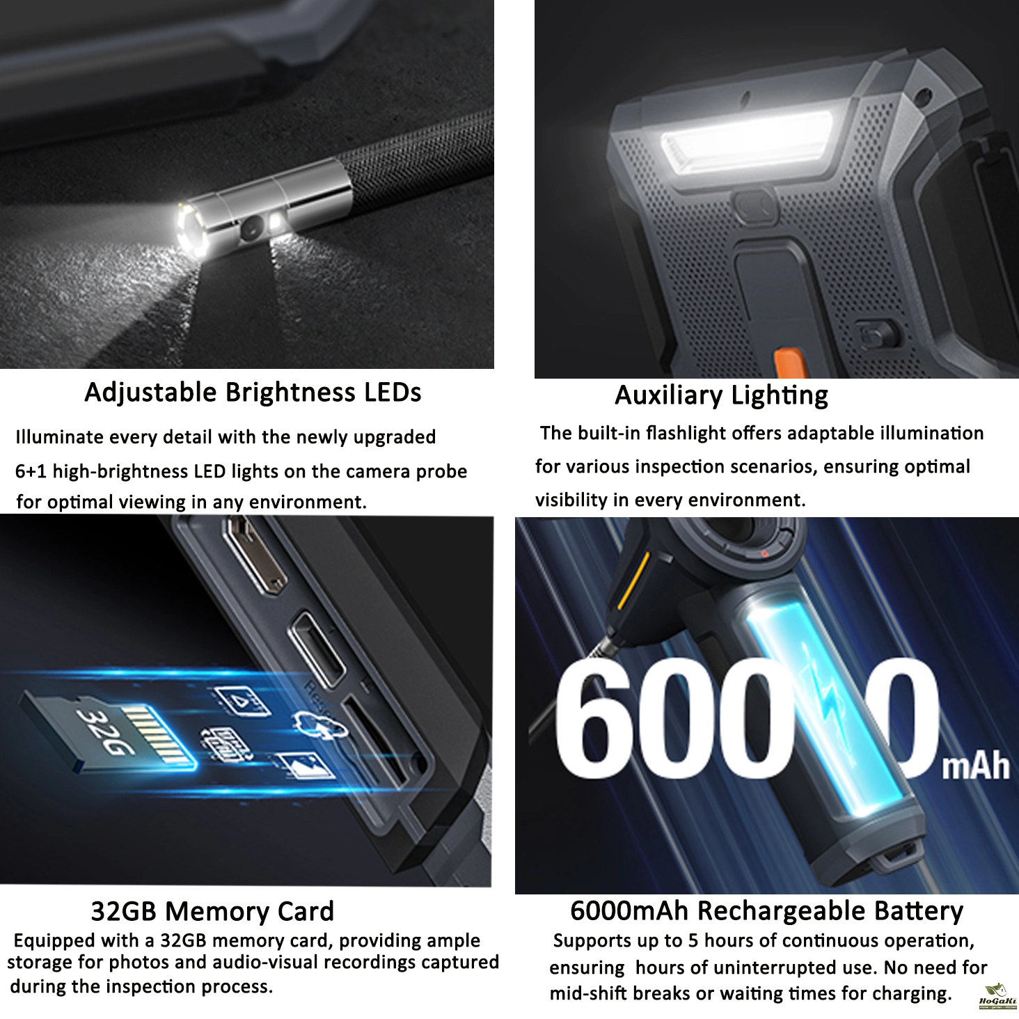 6-inch 1080P HD IPS Screen - The handheld monitor features a 6-inch color IPS LCD screen with a 1920x1080 resolution, providing clear and detailed imagery for accurate inspections. The device is powered by a 6000mAh rechargeable battery, ensuring long-lasting use. Constructed with industrial-grade materials, including toughened glass, it is both drop-resistant and slashproof, ideal for rugged industrial environments.