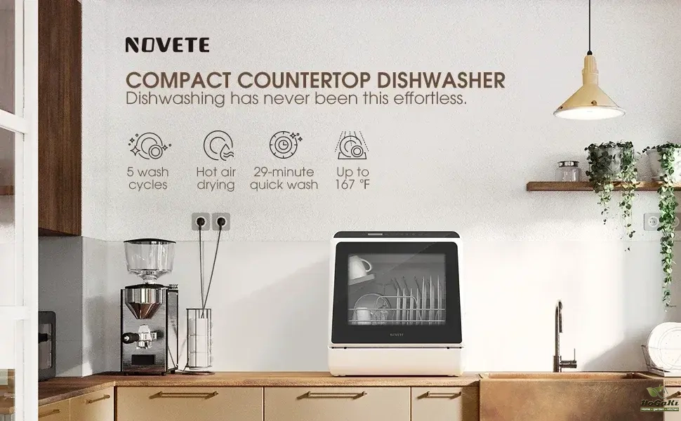 NOVETE countertop dishwasher is just over 18 inches tall and easily fits under most cabinets.The unique and innovative design makes this compact dishwasher save water, electricity, and detergent while maximizing cleaning performance, providing the ultimate in cleanliness for the whole family’s tableware.