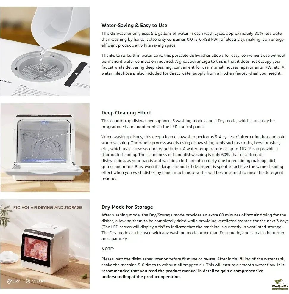 【BABY CARE MODE】This compact dishwasher offers 5 wash cycles - Normal, Speed, Soft, Baby Care/Heavy, and Fruit;the Baby Care/Heavy mode with 167 °F washing temperature is suitable for baby products and oily tableware, which rinses them thoroughly and gives glassware a sparkling clean finish
