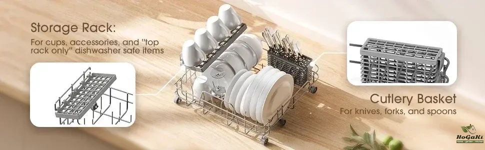 【FULLY EQUIPPED】The storage rack and cutlery basket make it easy to clean ''top rack only'' dishwasher safe items such as knives, forks, and spoons, leaving more space for dishes and small pots;lower and upper spray arms give dishes a streak-free deep cleaning, and the included fruit basket stores fruits and vegetables neatly and cleans them