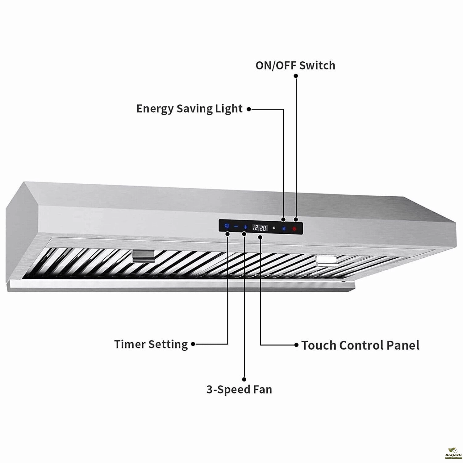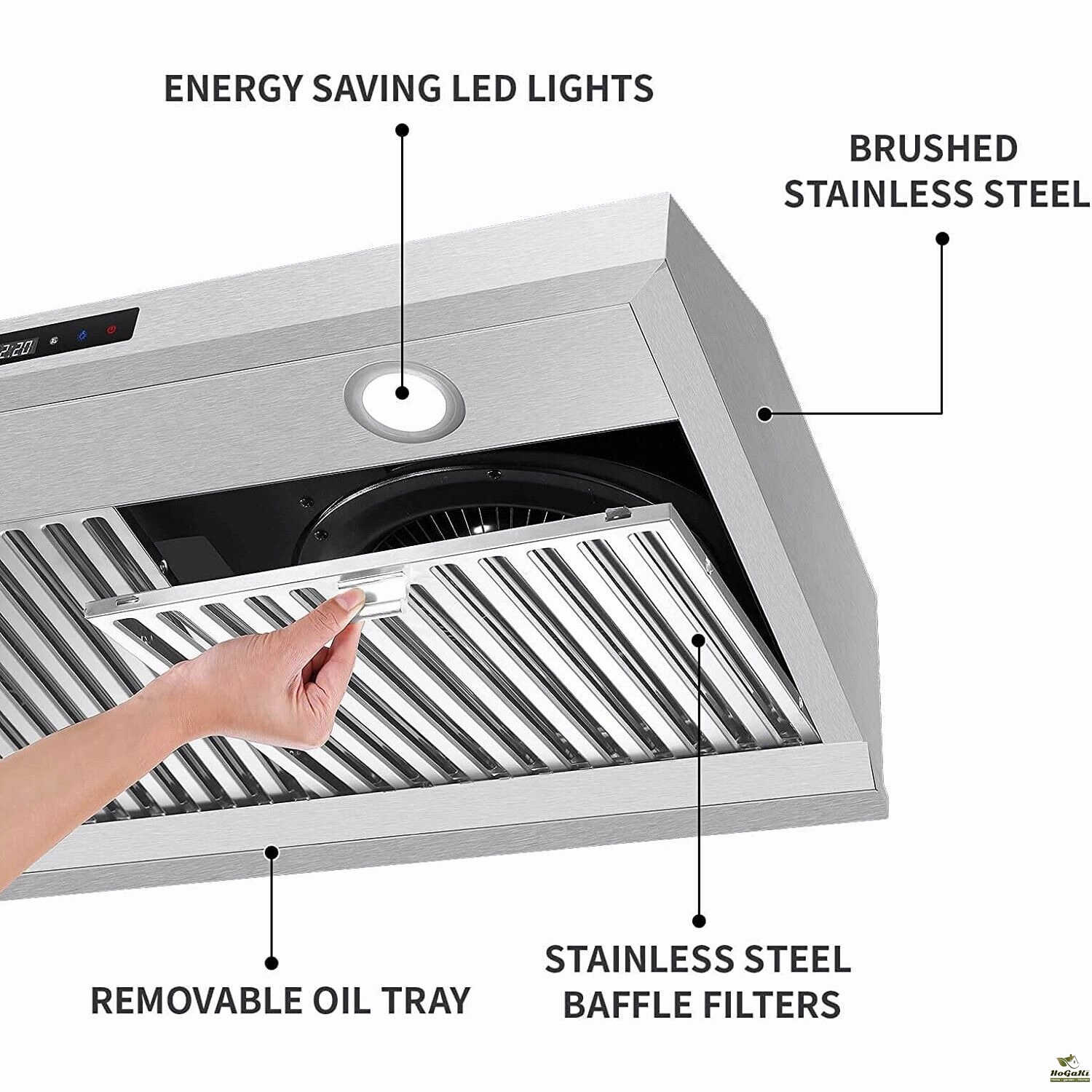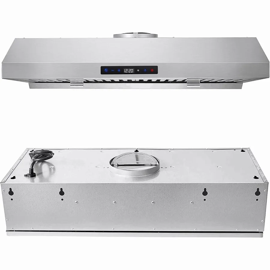 This stainless steel under cabinet range hood features a 800 CFM strong air-flow, provided by two powerful dual motors, matching with premium stainless steel baffle filters can easily trap grease and smell. External removable stainless steel oil collector, which is easy to clean and also dishwasher-safe, can help you away weary and bothersome daily house-work.