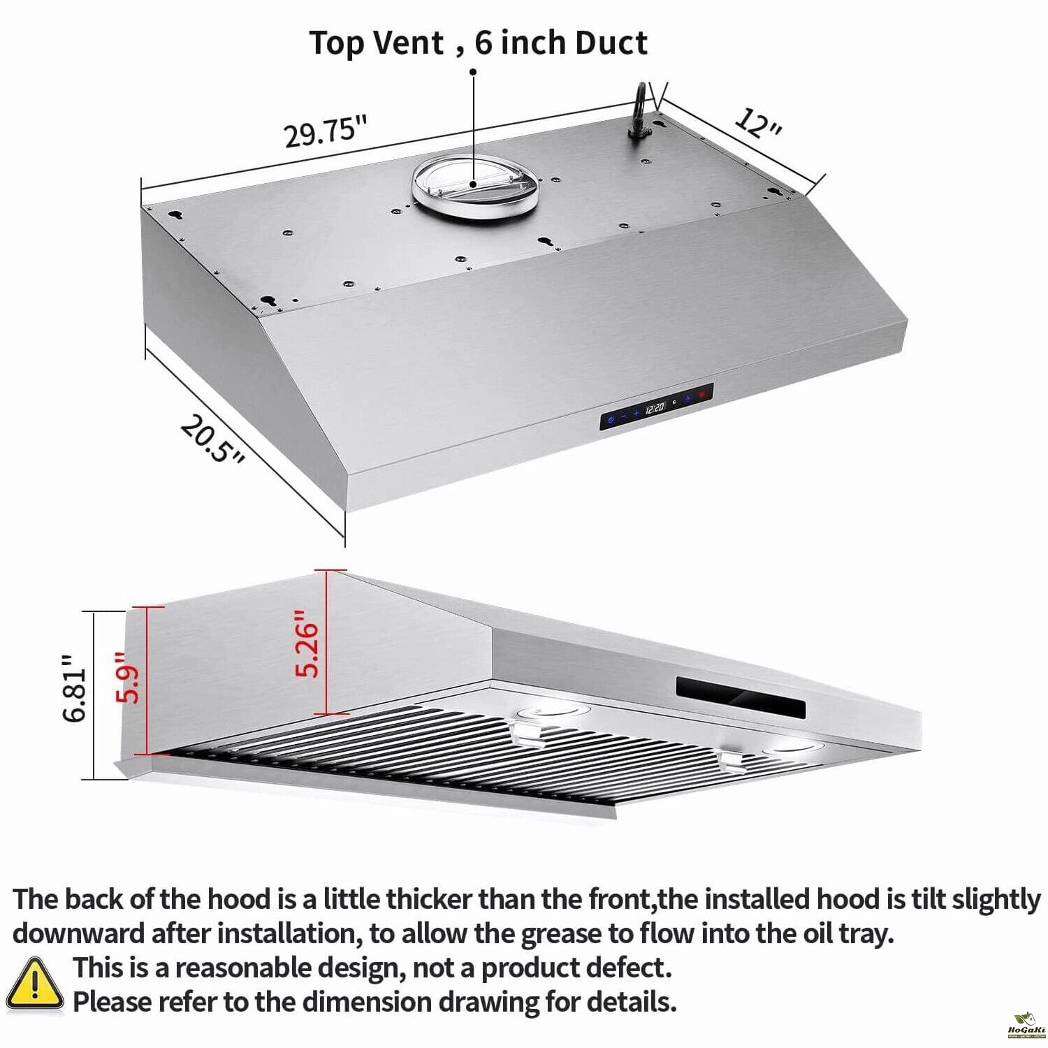 The back of the hood is a little thicker than the front,the installed hood is tilt slightly downward after installation, to allow the grease to flow into the oil tray. This is a reasonable design, not a product defect.