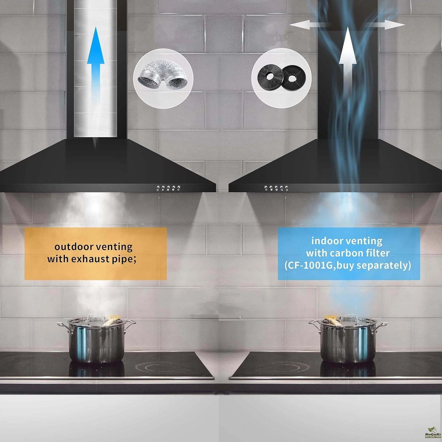 This kitchen hood has ducted a 6 inch round vent on the top, can use with an exhaust pipe to ducted outside; also can work with carbon filters for ductless use.