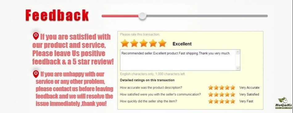 Your satisfaction and positive feedback is very important to us. Please leave positive feedback and 5 stars if you are satisfied with our items and services. If you have any problems with our items or services, please feel free to contact us first before you leave negative feedback. We will do our best to solve any problems and provide you with the best customer services.