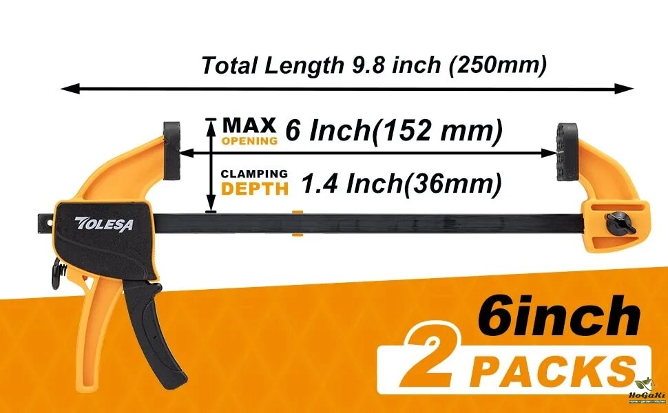 【6INCH Powerful Clamping Force】6 inch trigger clamp with up to 45lbs of squeezing force and a metal ratcheting mechanism, suit for light duty works, woodworking F clamps and DIY carpentry.
