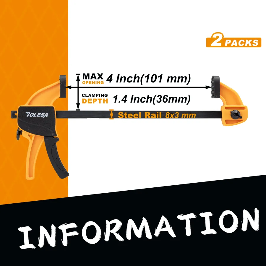 【4INCH Powerful Clamping Force】4 inch trigger clamp with up to 30lbs of squeezing force and a metal ratcheting mechanism, suit for light duty works, woodworking F clamps and DIY carpentry.