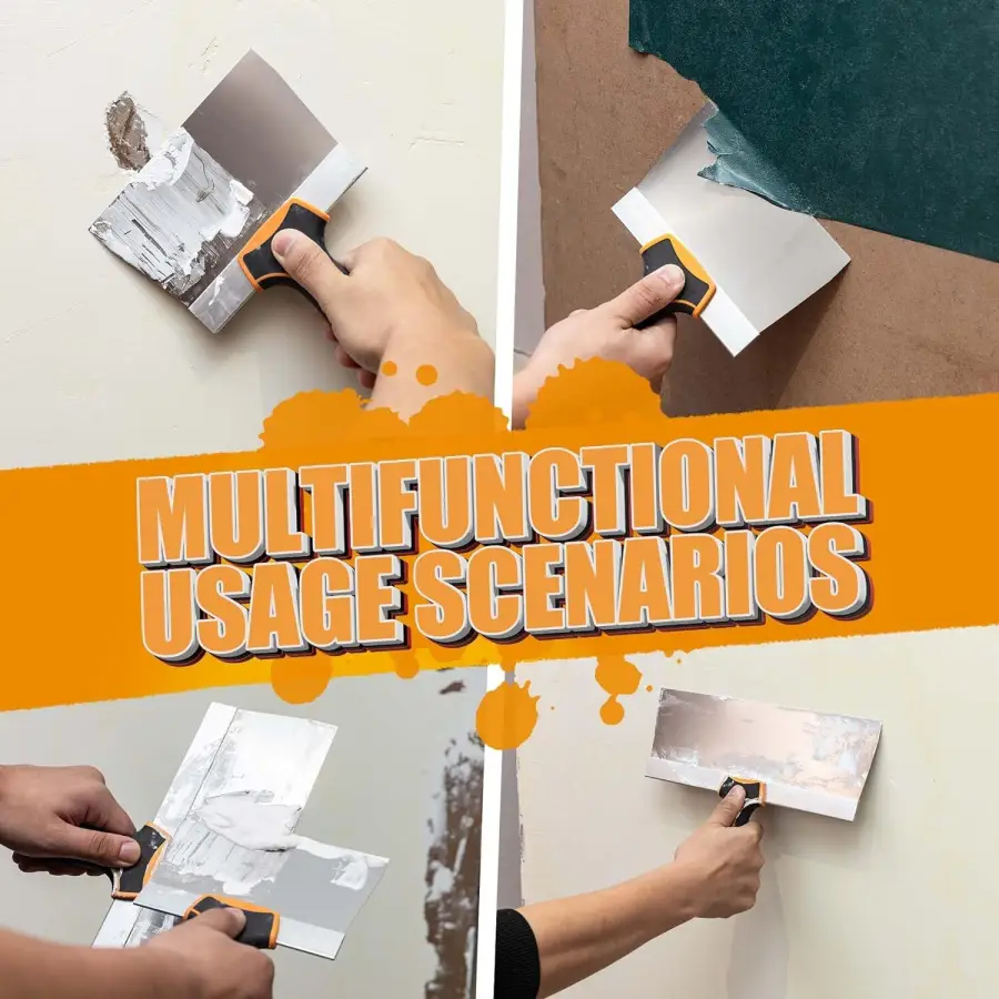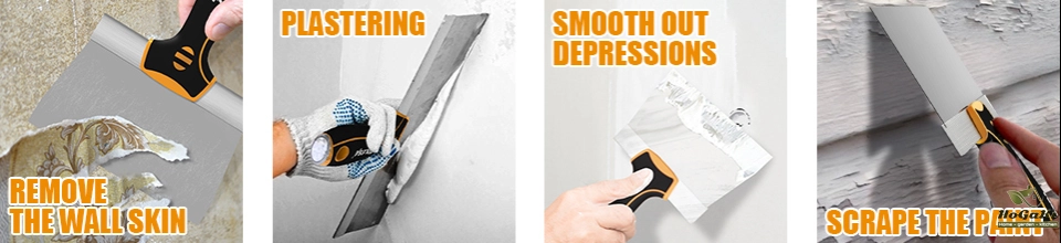 【Comfortable Grip & Sturdy Hammer End】 - The handle of putty knife is made of high density and lightweight nylon, covered with soft rubber and the anti-slip pattern is ergonomically designed, which is comfortable to hold and reduces your hand fatigue when using the espatulas para construccion. Our drywall repair tools kit with a metal hammer end for striking to facilitate the tough work and prevent the blades coming off the handle after striking