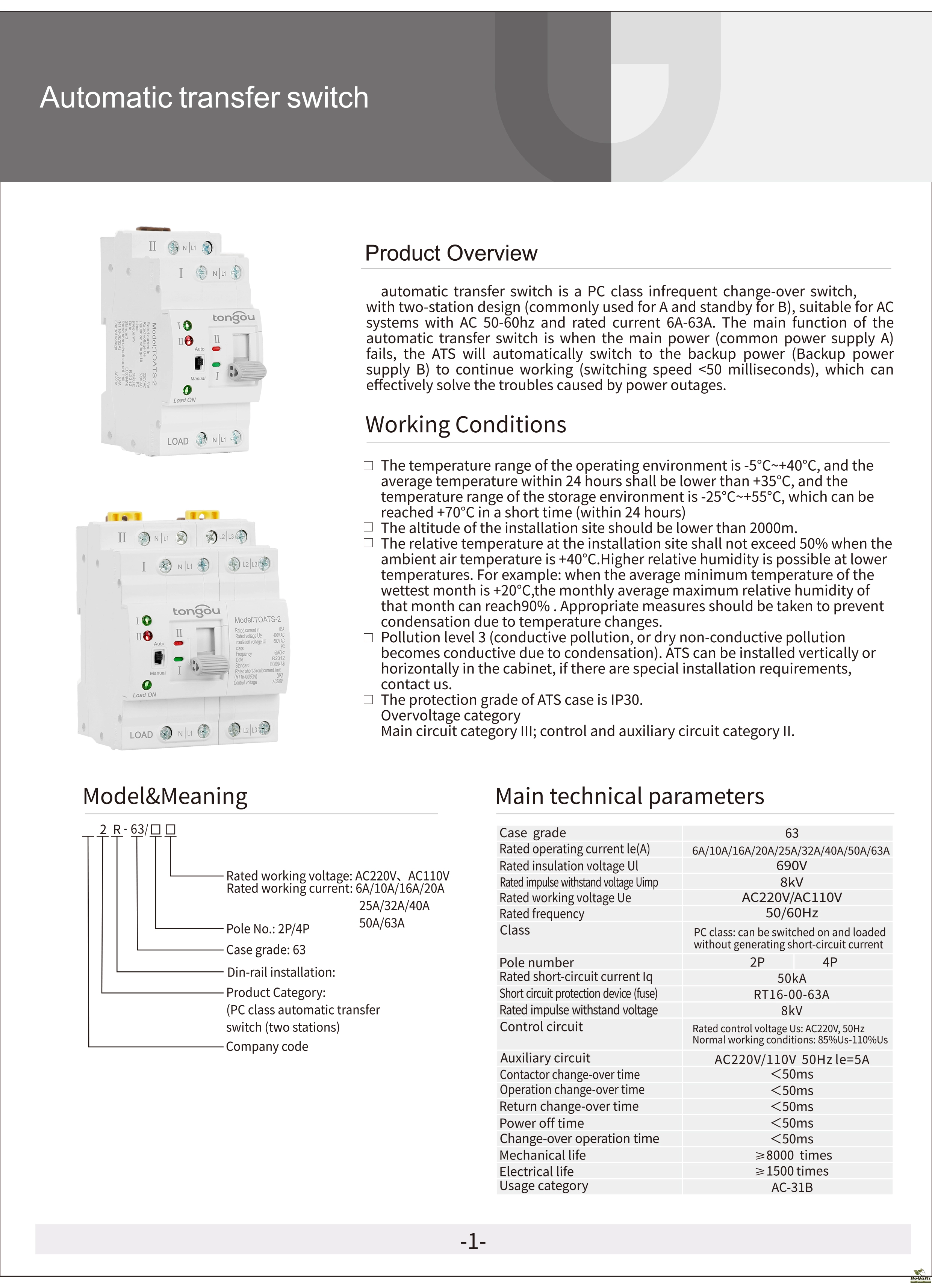 TOATS-2 automatic transfer switch is a PC class infrequent change-over switch, with two-station design (commonly used for A and standby for B), suitable for AC systems with AC 50-60hz and rated current 6A-63A. The main function of the automatic transfer switch is when the main power (common power supply A) fails, the ATS will automatically switch to the backup power (Backup power supply B) to continue working (switching speed <75 milliseconds), which can effectively solve the troubles caused by power outages.