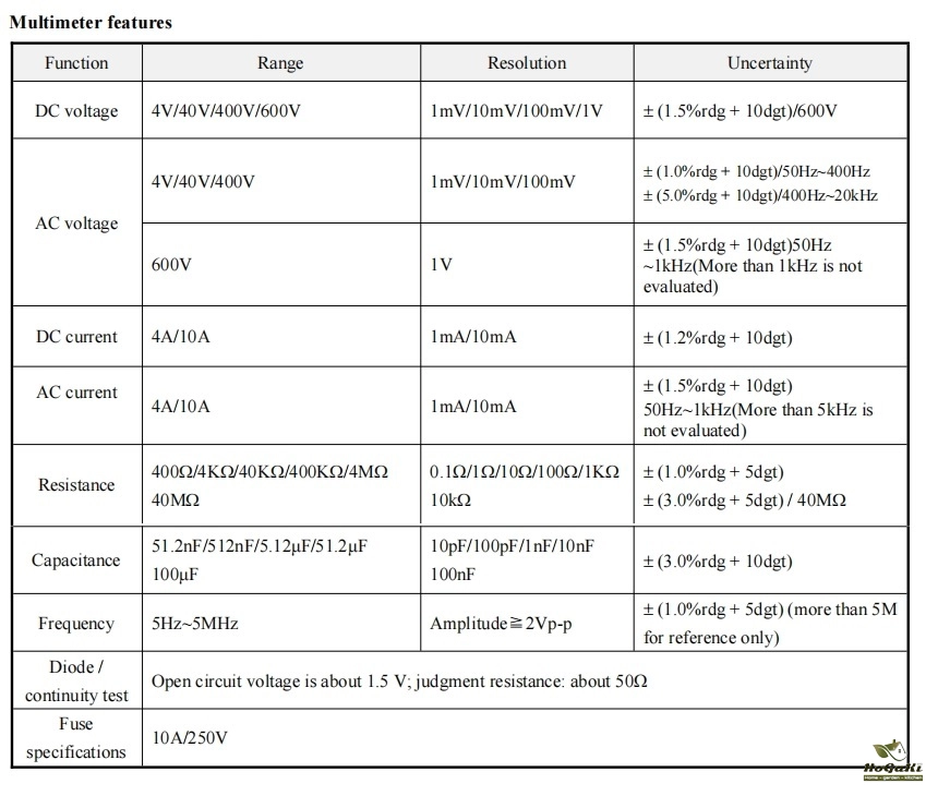 ◆ Multimeter functions include DC/AC voltage/current, resistance, capacitance, frequency, duty cycle,diode continuity test.