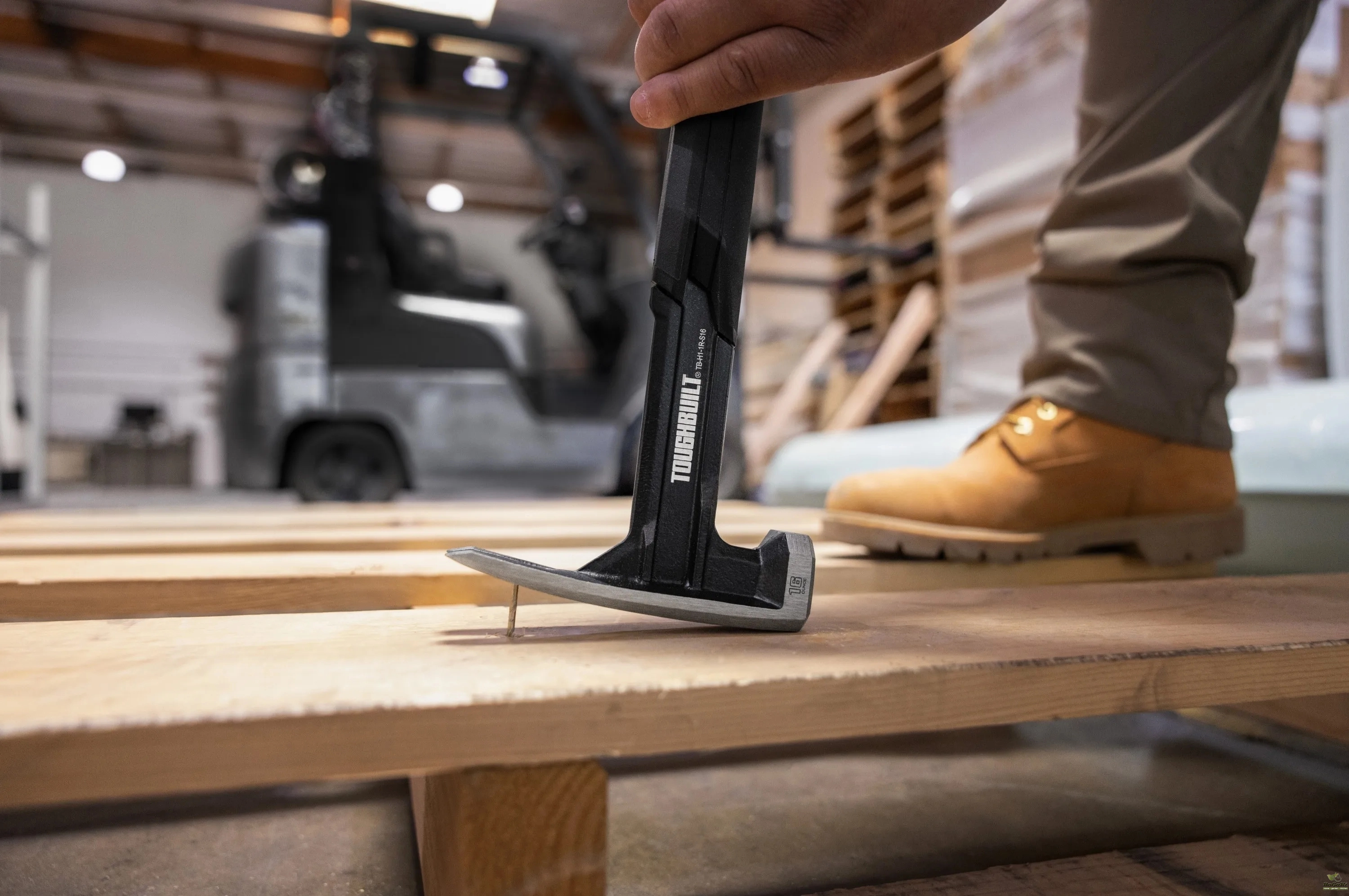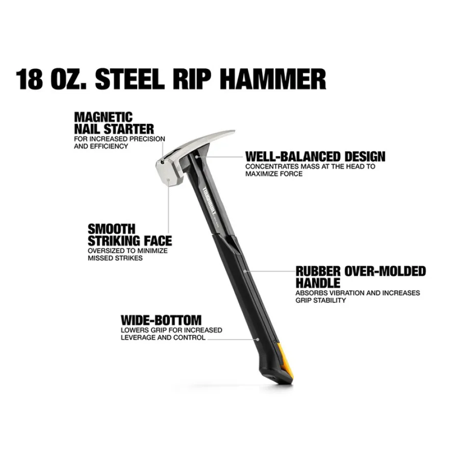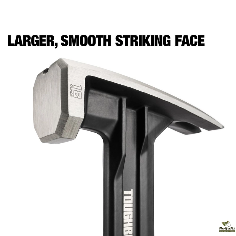 The ToughBuilt® 18 oz. Steel Rip Hammer- Smooth Face is a versatile option in our innovative line of steel hammers utilizing an oversized face for accurate repeated striking that assures Pros can use their hammer safer and more efficiently on the jobsite. Engineered for cross-platform utility, this 18. oz Steel Rip Hammer’s oversized face design features a smooth, polished face that drives nails while maintaining the integrity of finished materials. Designed for utility on any jobsite, this hammer sets the benchmark for accurate striking and driving across various materials with an integrated magnetic nail starter making placement simple and intuitive with a deep magnetic top channel for setting.