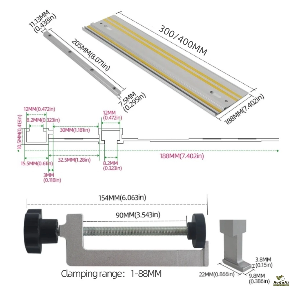 1* 300/400mm Guide Rail Clamp or 1*Guide Rail Connector or 1*Dhesive Tape