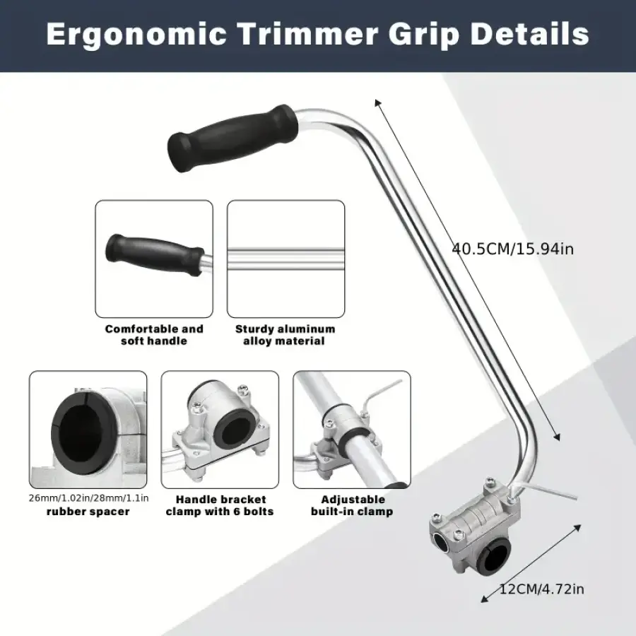 【Durable & Ergonomic Grip Handle】 weedeater grip handle is super durable and sturdy enough for extended use. The ergonomic trimmer grip adds only a negligible amount of weight to the trimmer shaft, making it easy to edge, trim, and maintain your yard, lawn, or landscaping. If your arms or back are bent after installing this trimmer handle, simply slide the vise up or down to find a comfortable position.