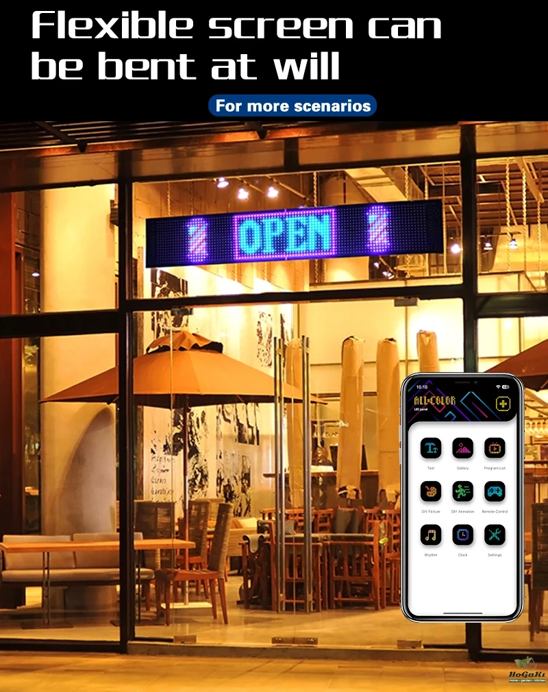 LED sign is controlled by a Bluetooth-connected app, which supports connecting multiple LED displays at the same time, making your store more eye-catching, the app has built-in many interesting modes and animations. Your phone makes it easier to customize fun patterns and text to personalize your store.