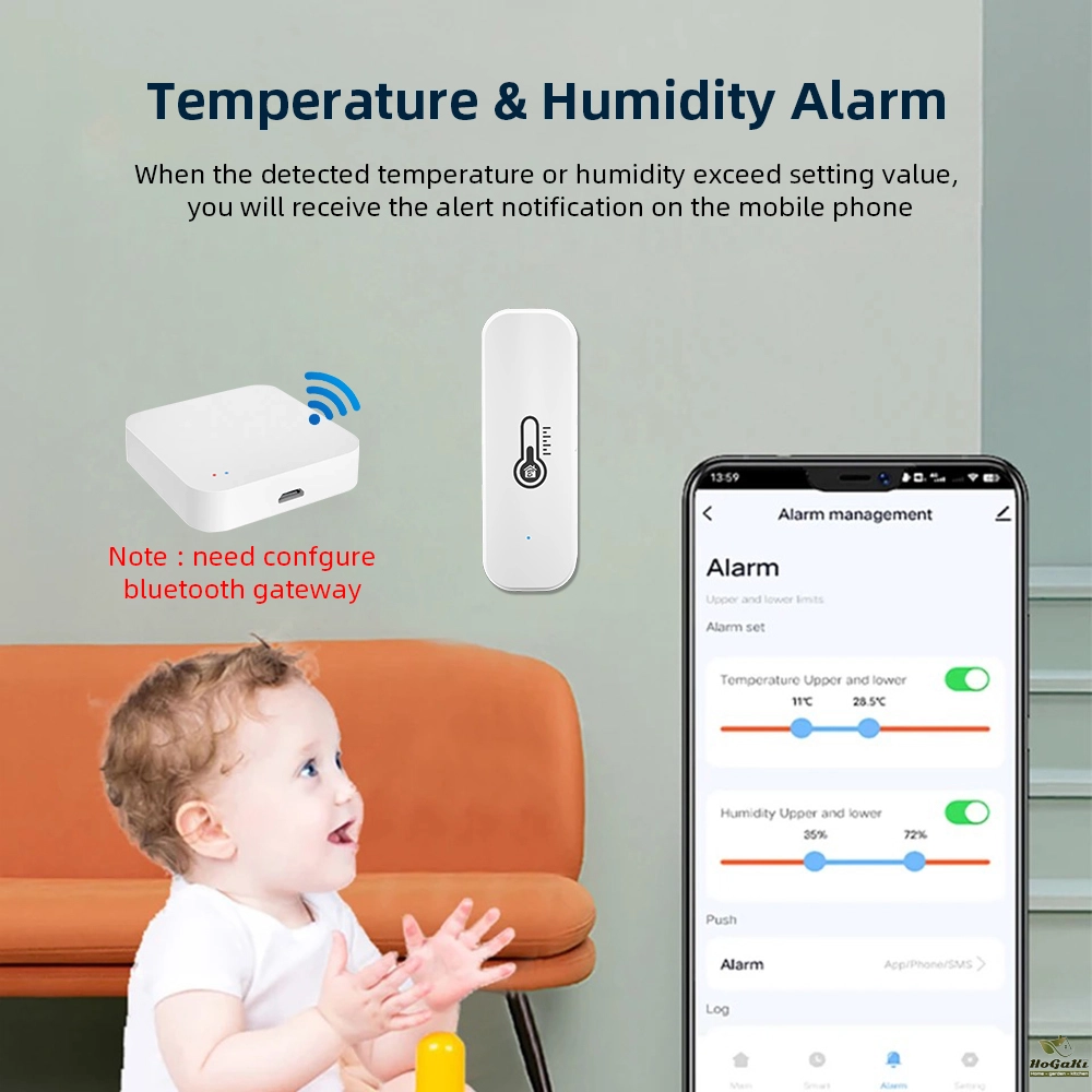 If it is configured to tuya bluetooth gateway, you can monitor temperature and humidity on the APP any where.