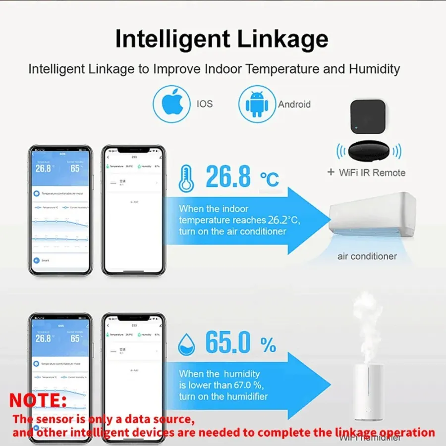 The sensor will report when the temperature and humidity. You can view the changes in the value on the APP or display screen.