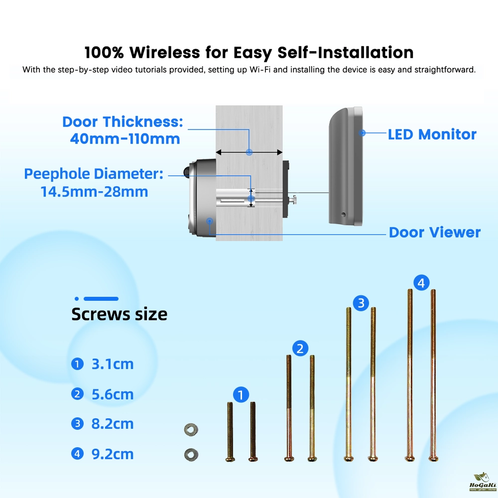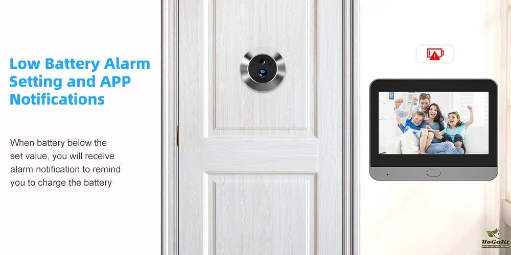 Built-in 5000 mAh rechargeable large capacity battery supports 30 days long standby (usually 5-10 calls per day), low battery reminder and Type-C port charging. This digital door viewer supports both iOS and Android, download the Smart Life App to receive every detail of what happens every day at your front door anytime, anywhere. Never miss a visitor or prevent theft, strangers or voyeurs.
