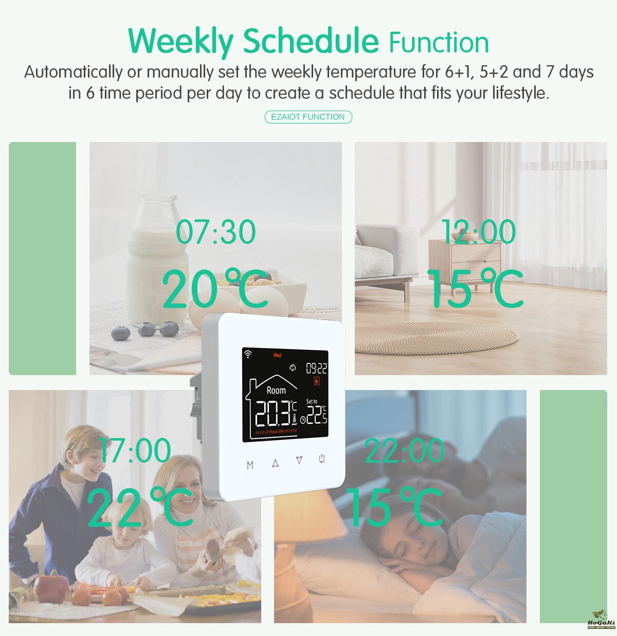 Automatically or manually set the weekly temperature for 6+1, 5+2 and 7 days in 6 time period per day to create a schedule that fits your lifestyle.