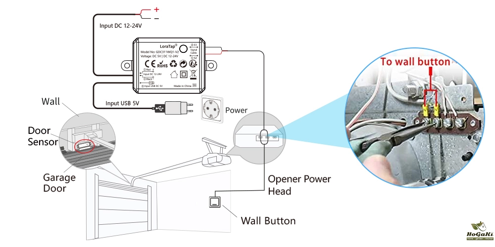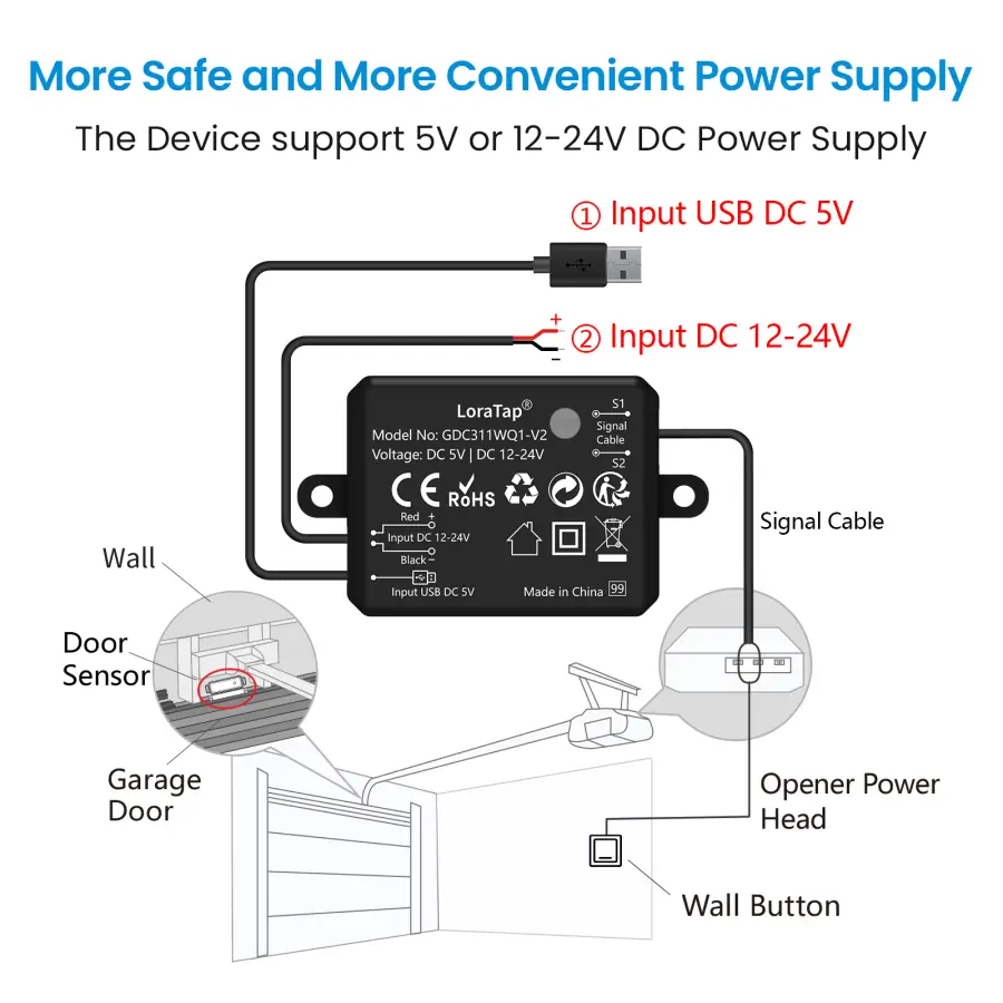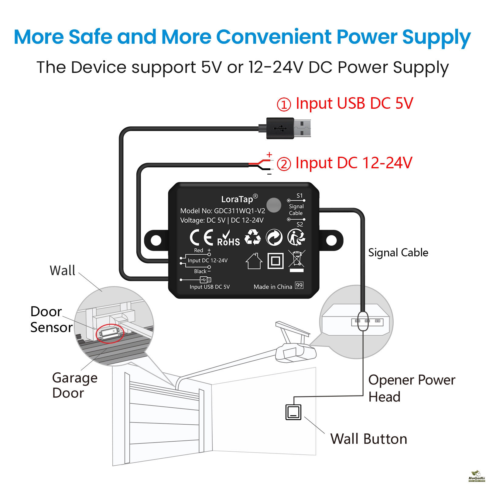 (1) DC 12-24V, you can connect to your garage door motor through wires, convenient for the equipment to power supply.