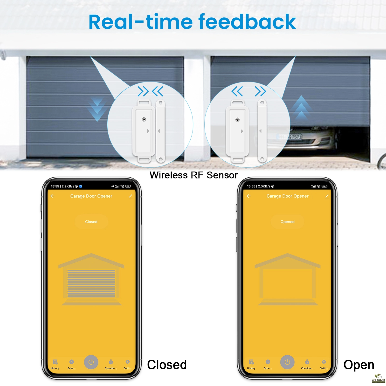 3、Smart your garage Door by phone, Remote and Voice Control, just tapping the Tuya or Smart Life App from anywhere or speaking to your Alexa, Google Assistant . Enable the door open or close even when you are not at the site.