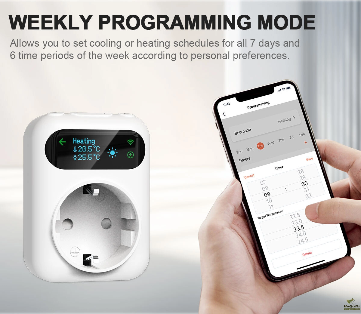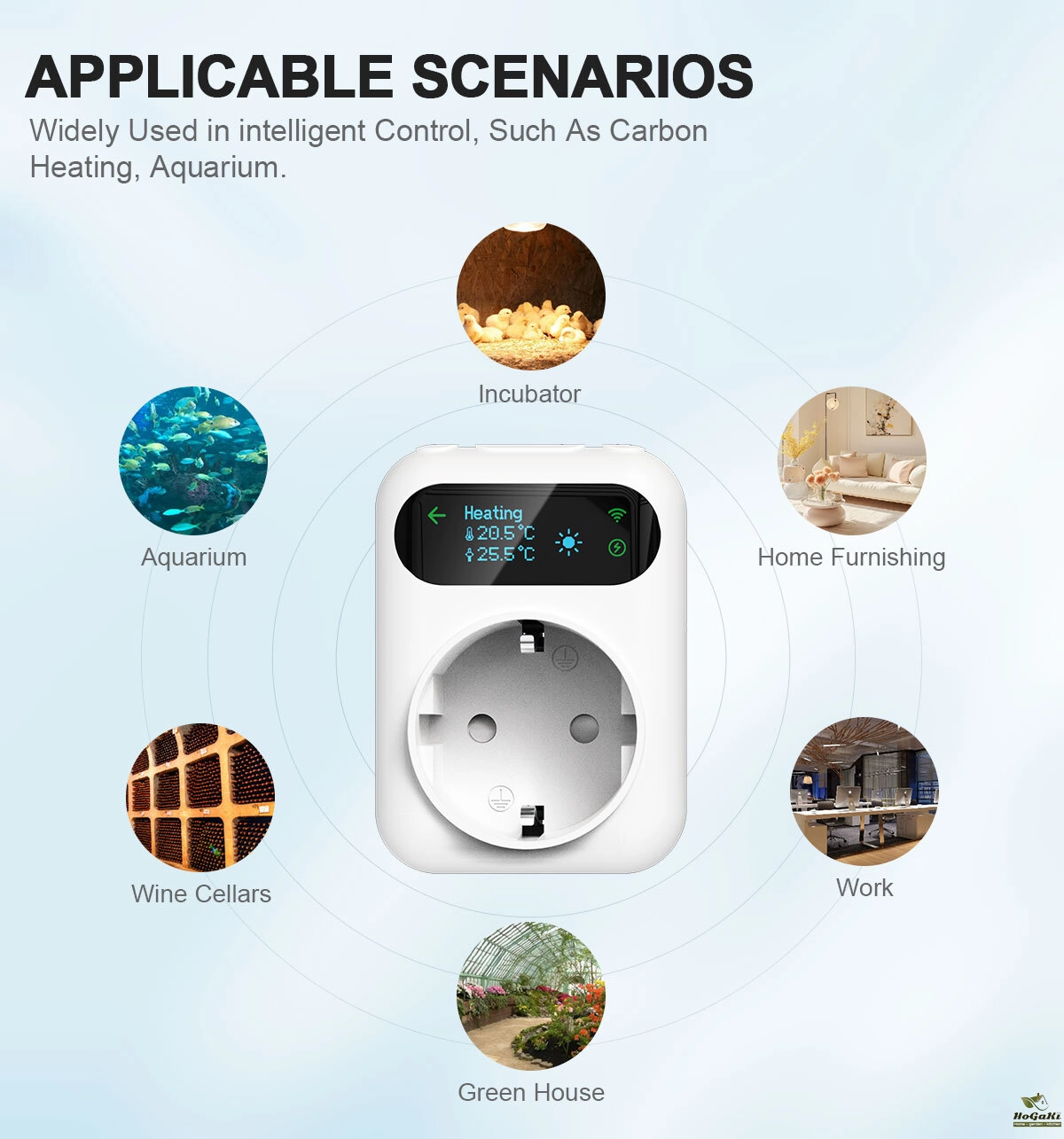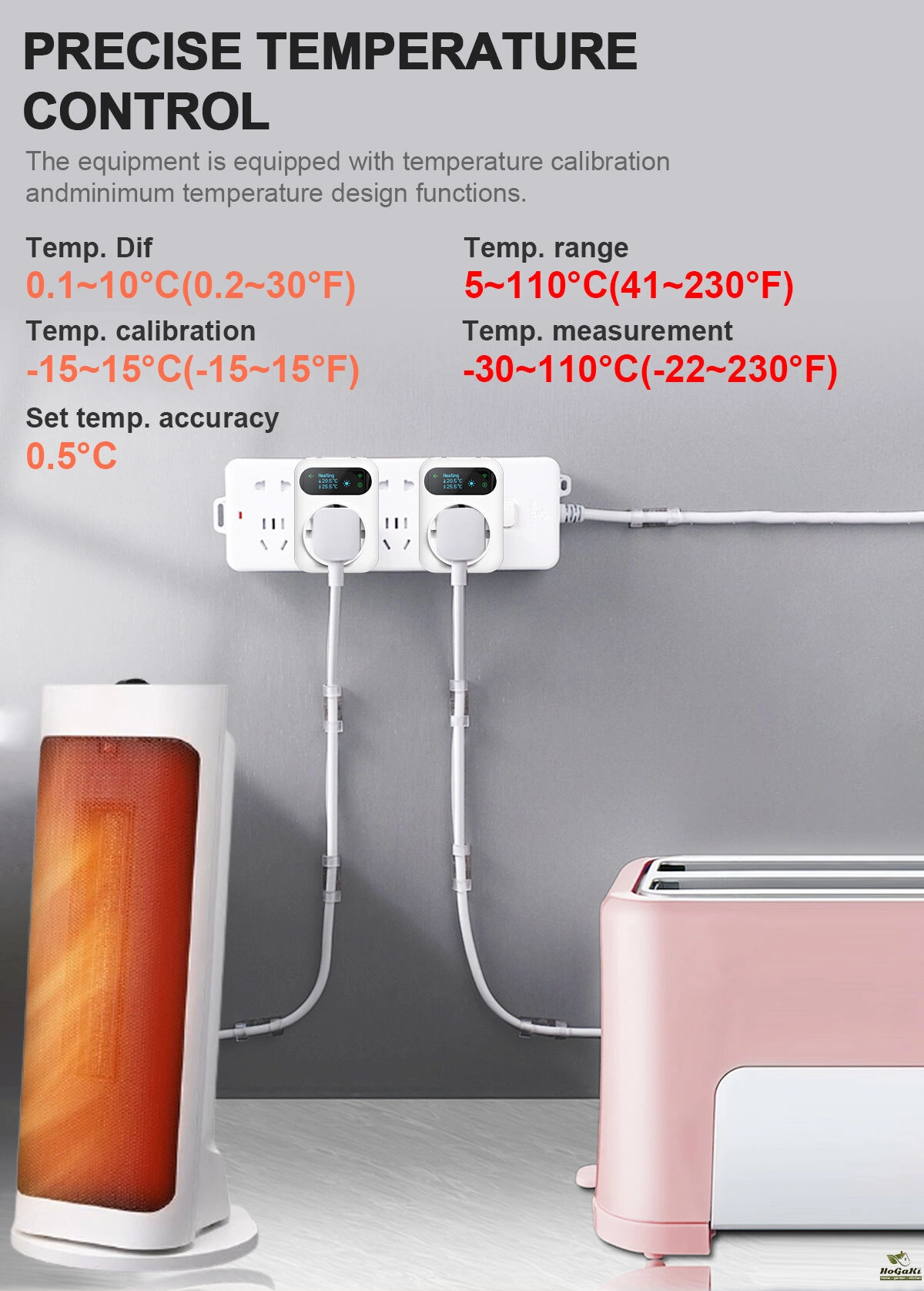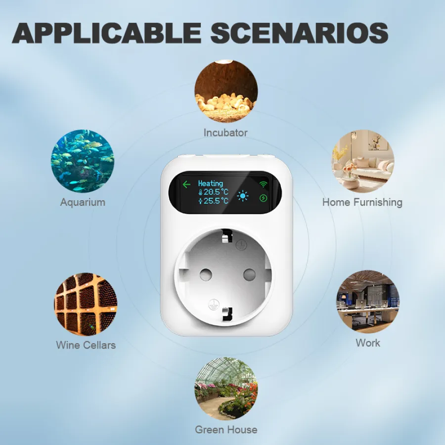 This is a plug-in digital temperature controller with cooling, heating, and timing functions. No wiring needed, no drilling required, plug and play. The temperature control is accurate to 0.1℃ and the screen displays real-time temperature and status. Users can control it remotely via APP or through Alexa and Google Voice commands. It can also be operated manually via buttons when not connected to the internet. In addition to saving electricity while maintaining comfort, it includes protection features such as high/low temperature alarms, compressor protection high-quality flame-retardant materials, and a Childproof safety design.
