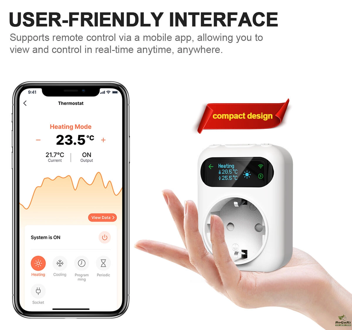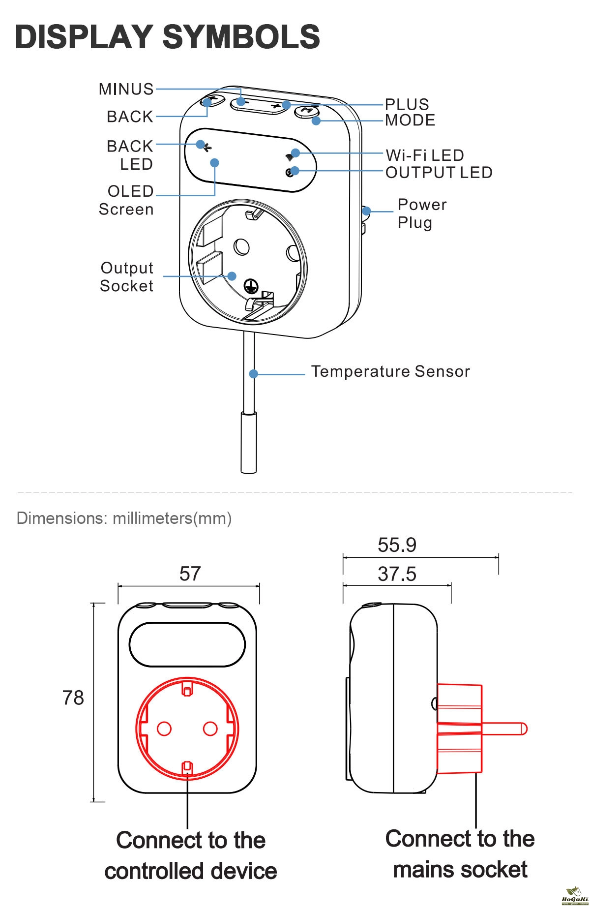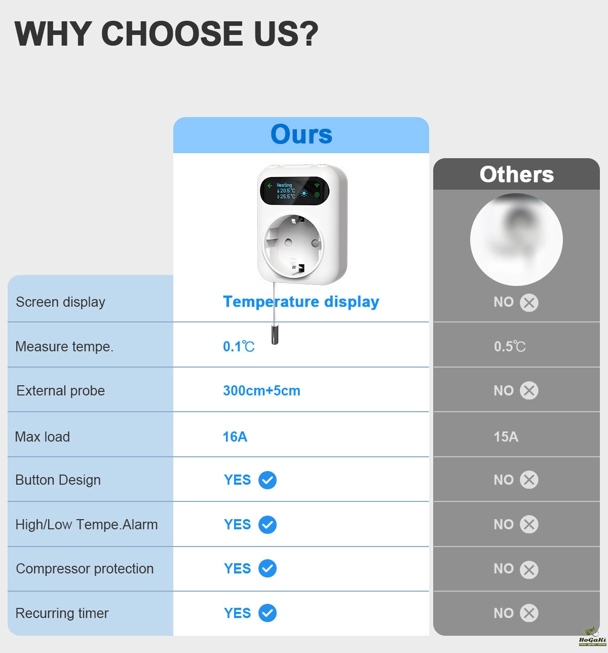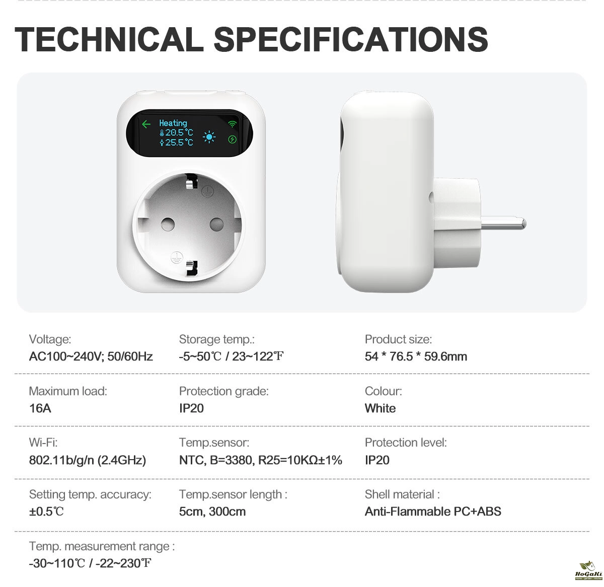This is a plug-in digital temperature controller with cooling, heating, and timing functions. No wiring needed, no drilling required, plug and play. The temperature control is accurate to 0.1℃ and the screen displays real-time temperature and status. Users can control it remotely via APP or through Alexa and Google Voice commands. It can also be operated manually via buttons when not connected to the internet. In addition to saving electricity while maintaining comfort, it includes protection features such as high/low temperature alarms, compressor protection high-quality flame-retardant materials, and a Childproof safety design.