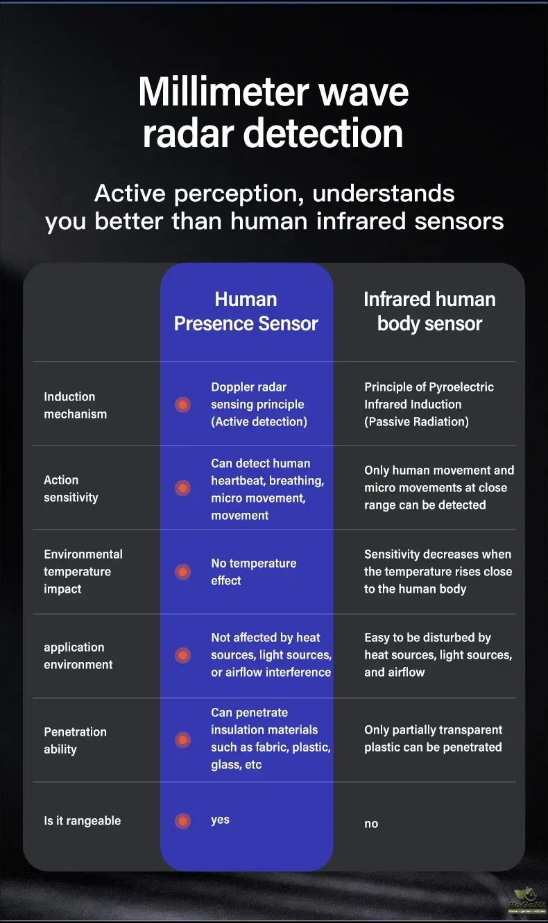 Tuya millimeter wave radar can detect the movement of objects or small movements of objects.Compared to infrared PIR, it has many advantages. Traditional PIR can only detect movements with infrared radiation and cannot detect small movements with infrared radiation. Millimeter wave radar can detect object movement and detect small movements of objects.