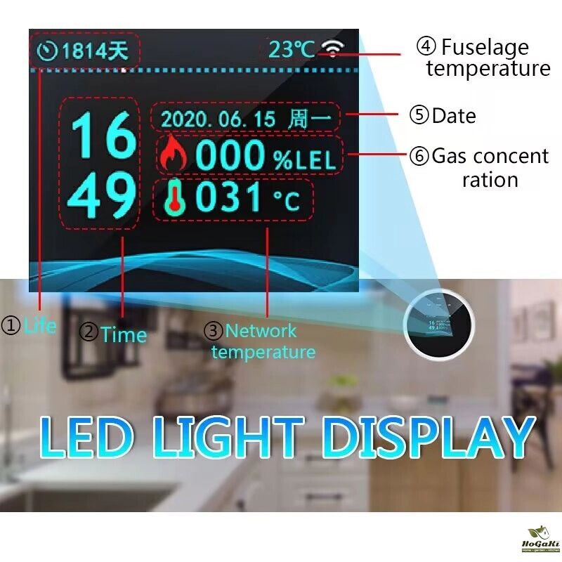 When the gas concentration or temperature reaches a certain height, it displays a red light, and other states display a green light.