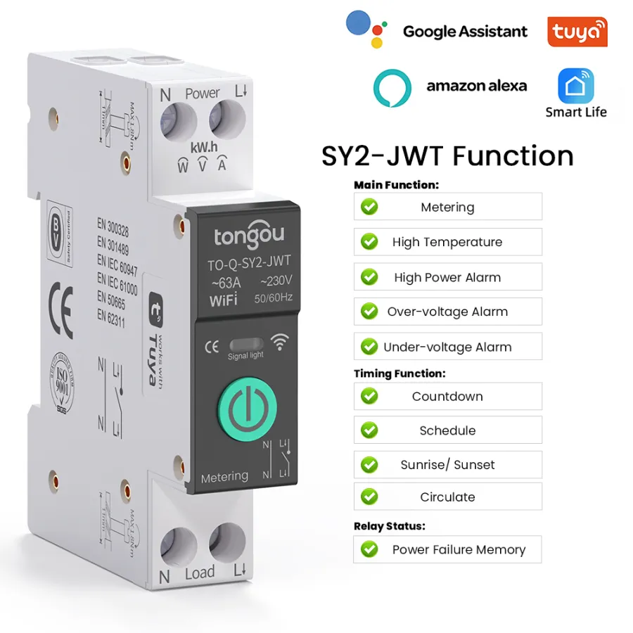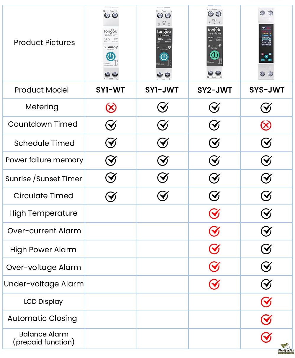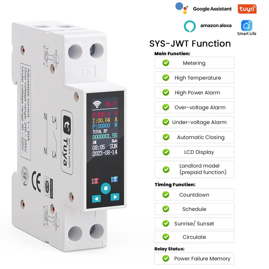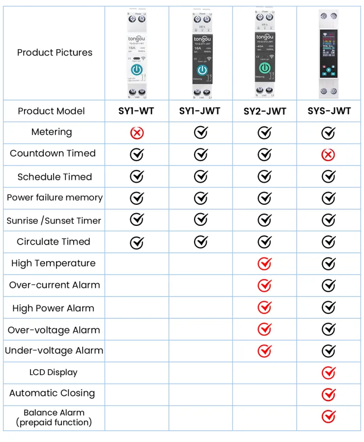 Product Model Metering Countdown Schedule Sunrise/Sunset Memory Circulate High Temperature High Power Alarm Over-voltage Alarm Under-voltage Alarm Automatic Closing LCD Display |