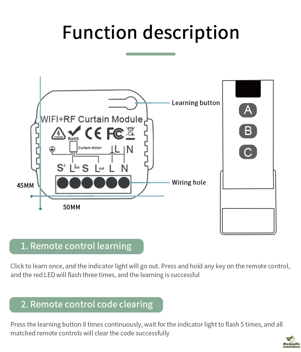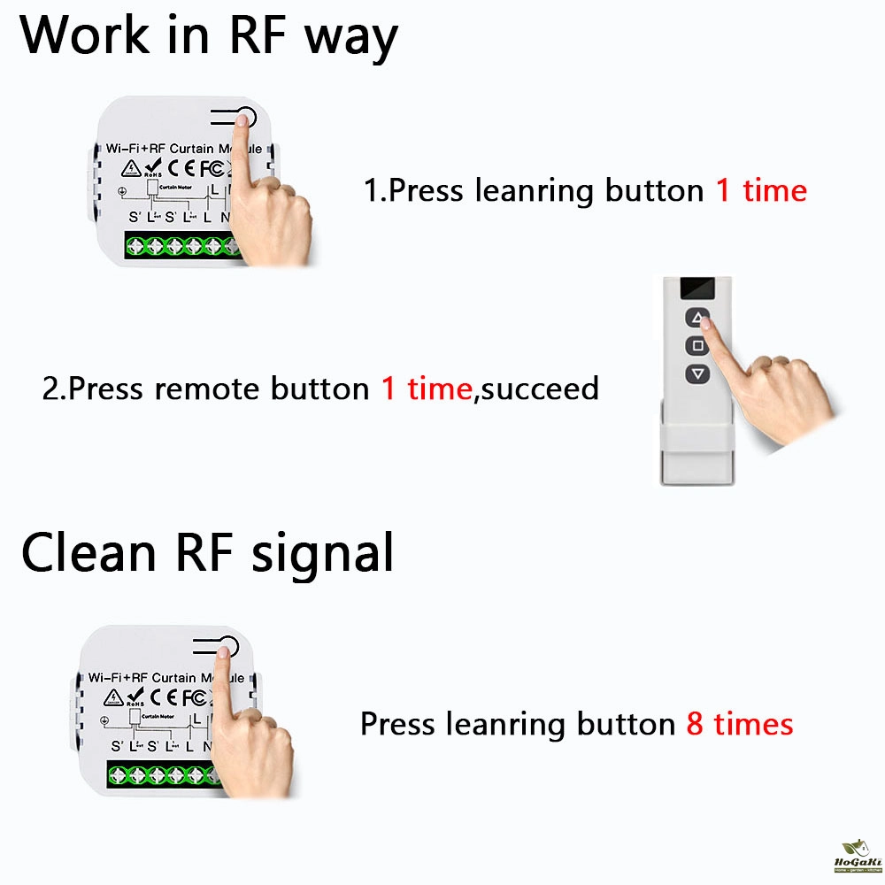 [RF and Wireless Remote Control with a much easier pairing mode] For adding the device with WiFi and Bluetooth connected: Able to remotely control your connected devices on your smartphone wherever you are. (Compatible with Android & iOS for Smart Life and Tuya App.) More importantly, this curtain switch module built-in RF433 frequency, so it Can be controlled with remote switch.