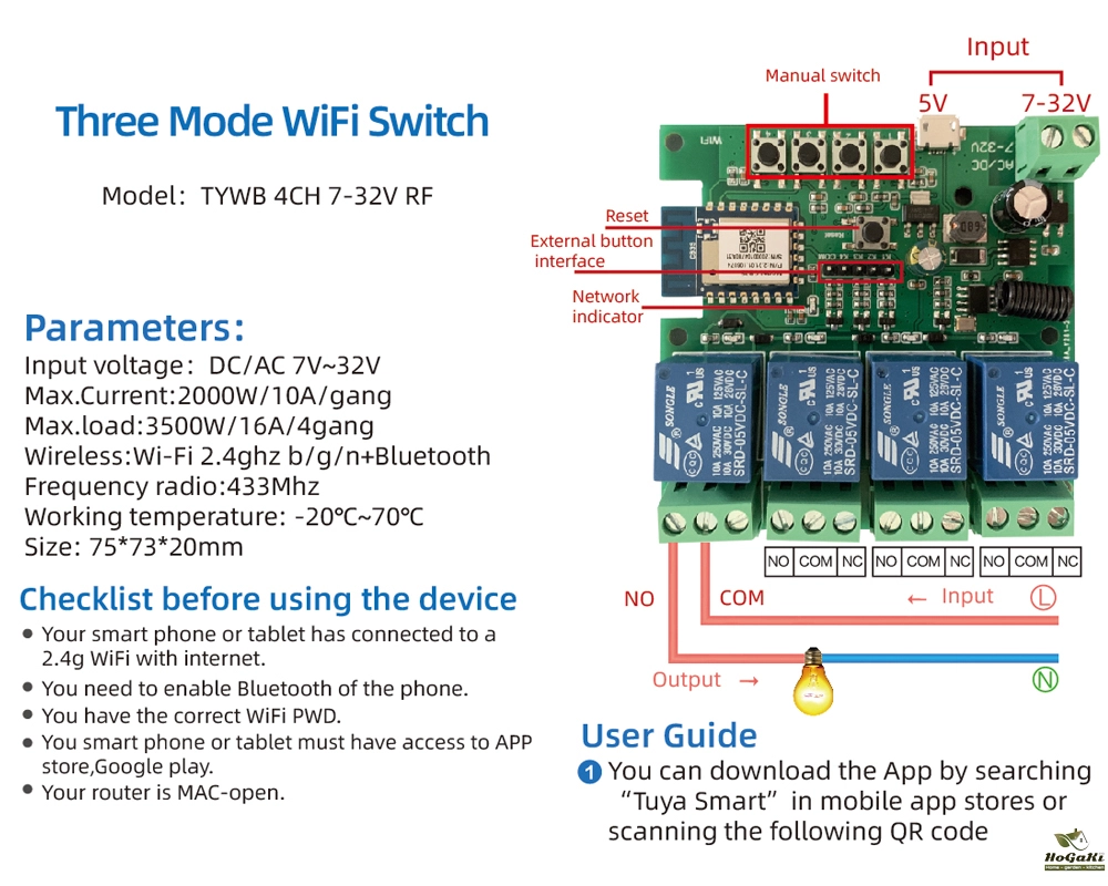 Input voltage : DC/AC 7-32V , AC 85-250V, Micro USB 5V input.