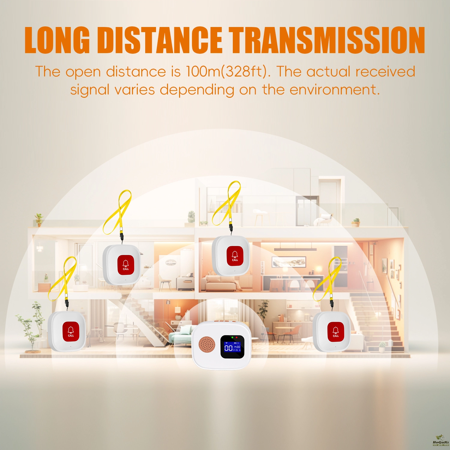 Easy to use for the elderly: if an elderly person needs help, press the emergency call button, and the receiver triggers an alarm that can also be heard on the connected mobile phone