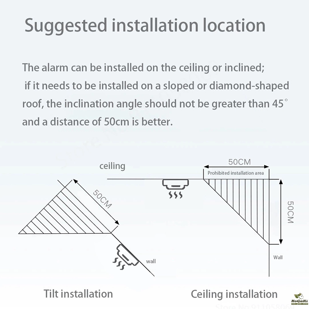 The alarm can be installed on the ceiling or inclined; if it needs to be installed on a sloping roof or a diamond-shaped roof, the inclination angle should not be greater than 45°, and the distance is 50cm.