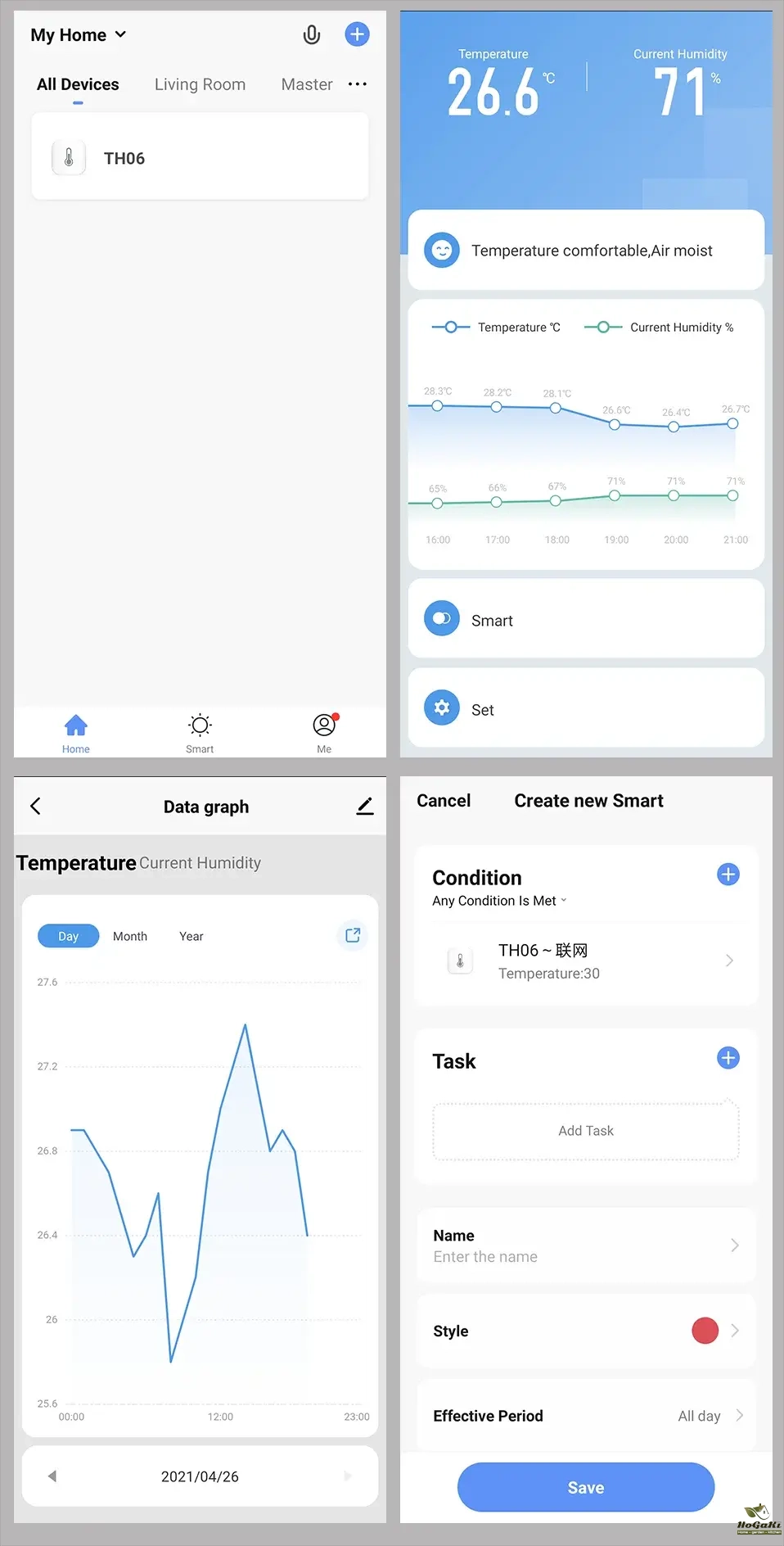 High-precision and real-time monitoring help you complete different linkage strategies. For example, if the temperature reaches 32.6 degrees Celsius, than turn on the air conditioner through our universal remote control. Or turn on the humidifier when the humidity is less than a certain value.