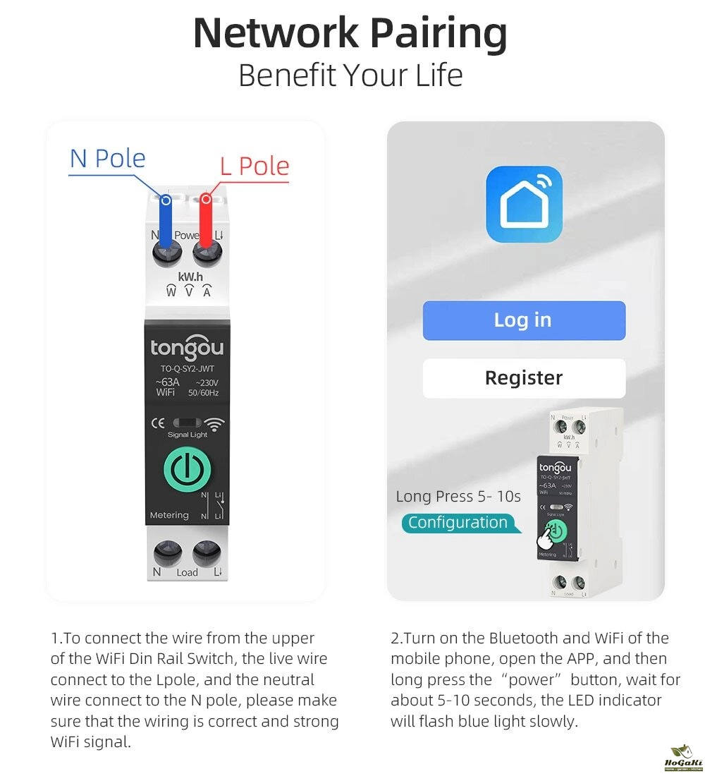 1 . To connect the wire from the uppper of the WiFi DINRail Switch , the live wire connect to the Lpole , and neutral wire connect to the N pole , please make sure that the wiring is correct and strong WiFi signal.