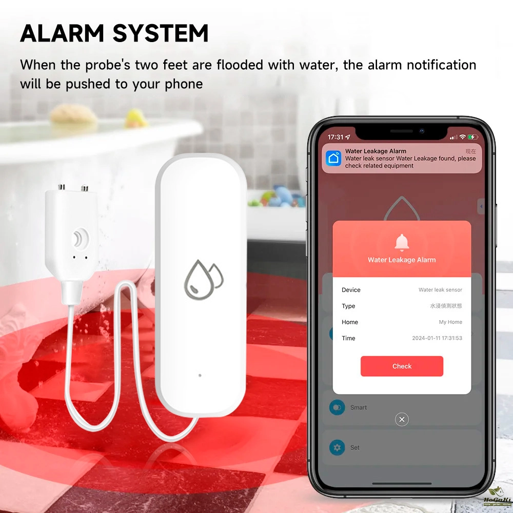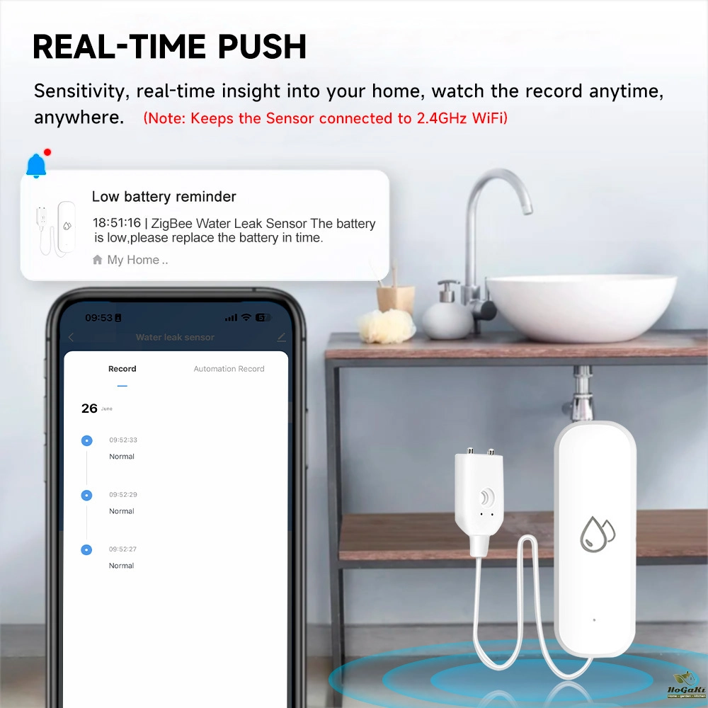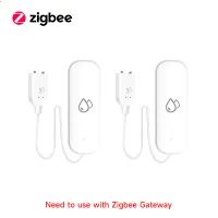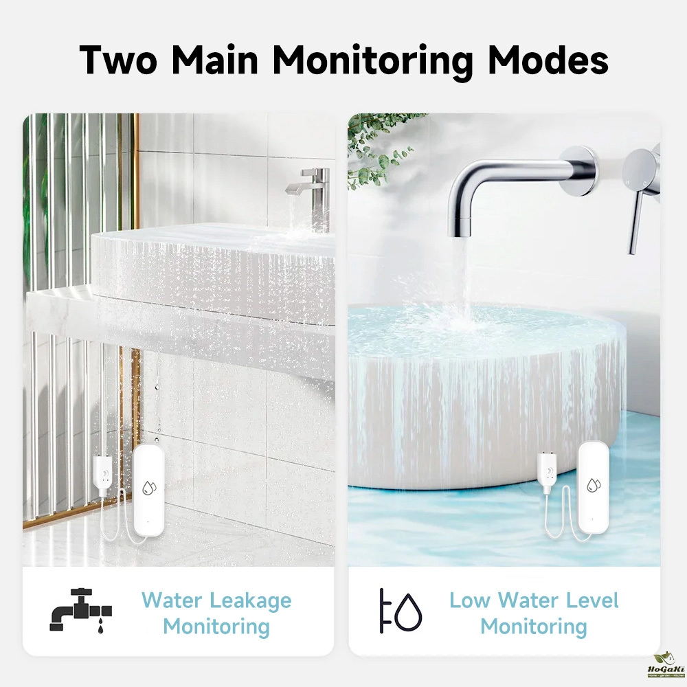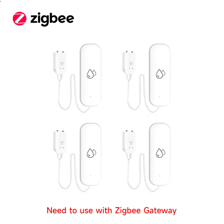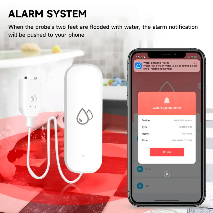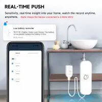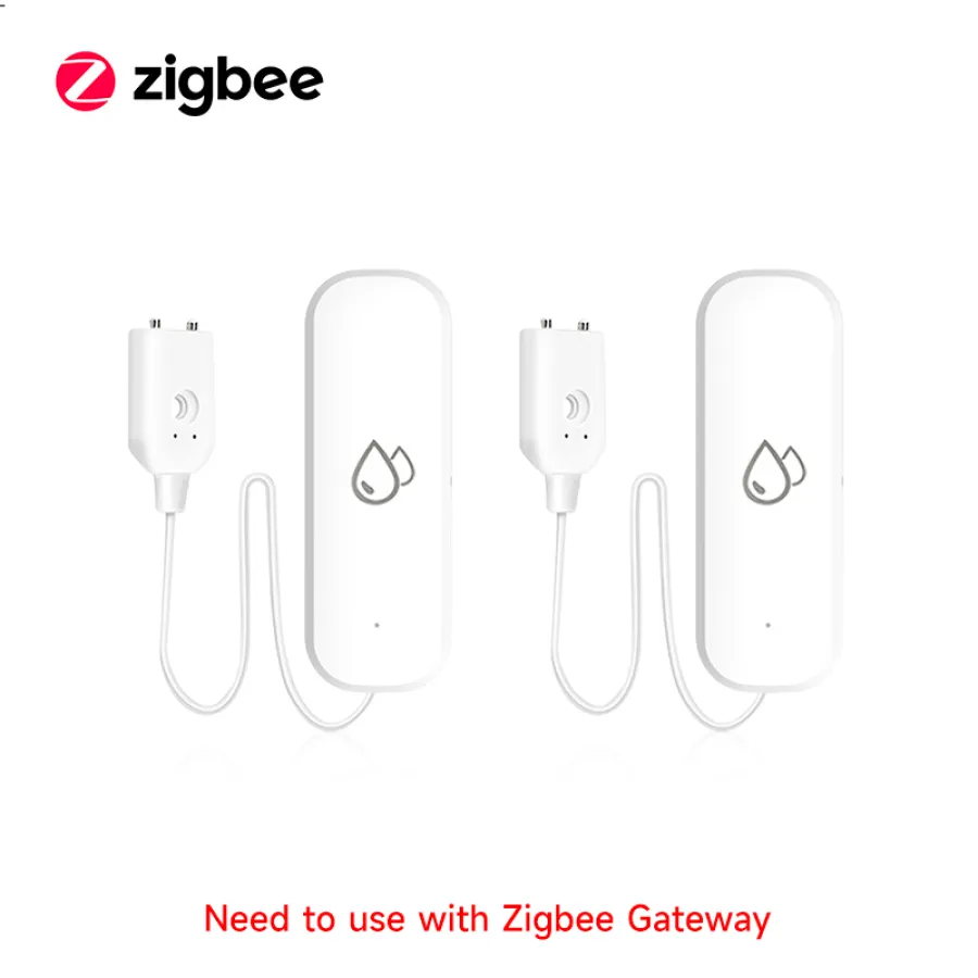 A water immersion sensor that can detect water leakage in the environment in real time. When water immersion is detected, the detector will send an alarm signal to the host and report the information to the user's mobile phone. When the water level at the detection point reaches 0.5mm, the water intrusion sensor will report the water condition.