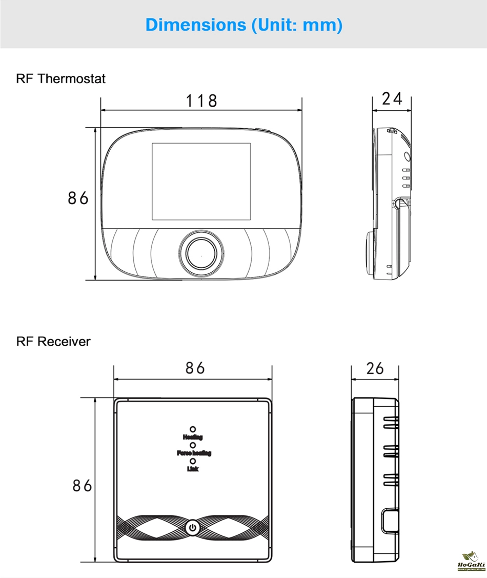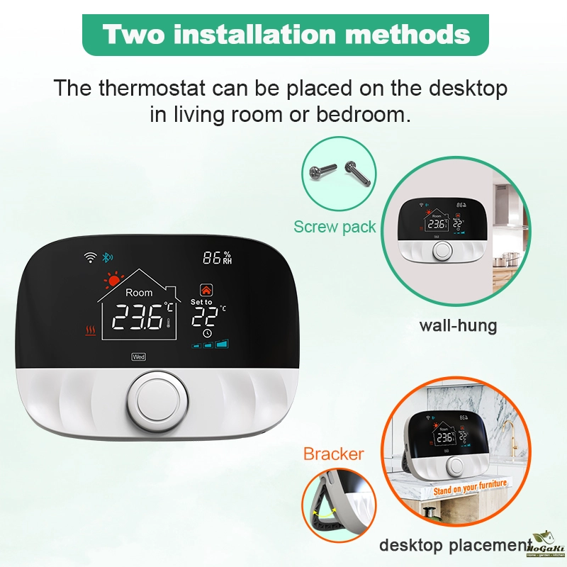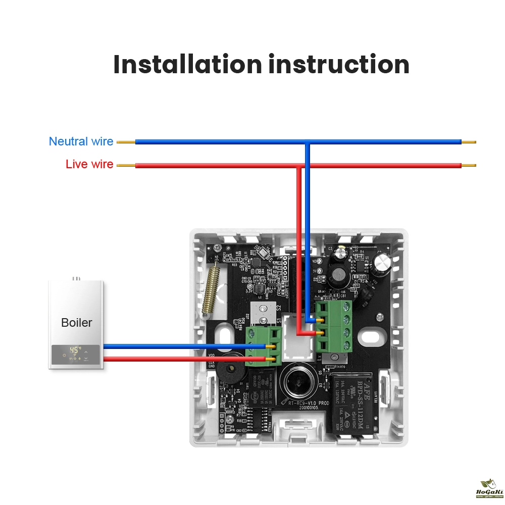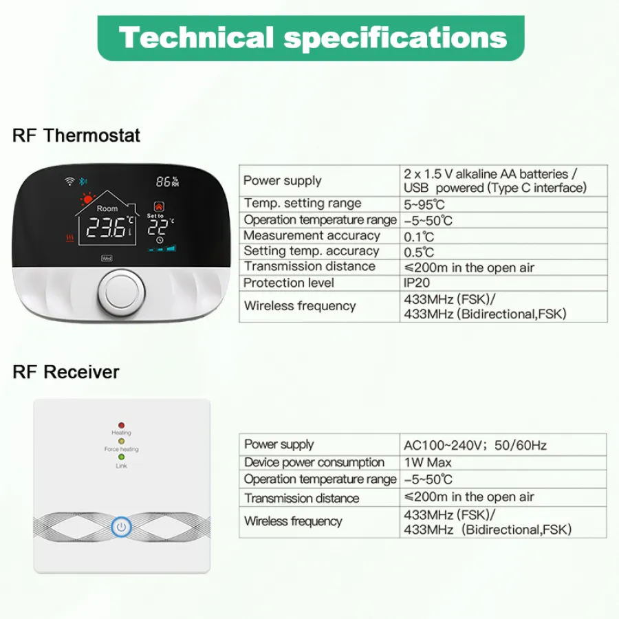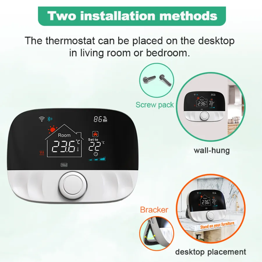 The receiver is connected to the boiler (dry contact) or electric floor heating (16A). You can place the controller in any room.Desktop Type or wall-hung Install