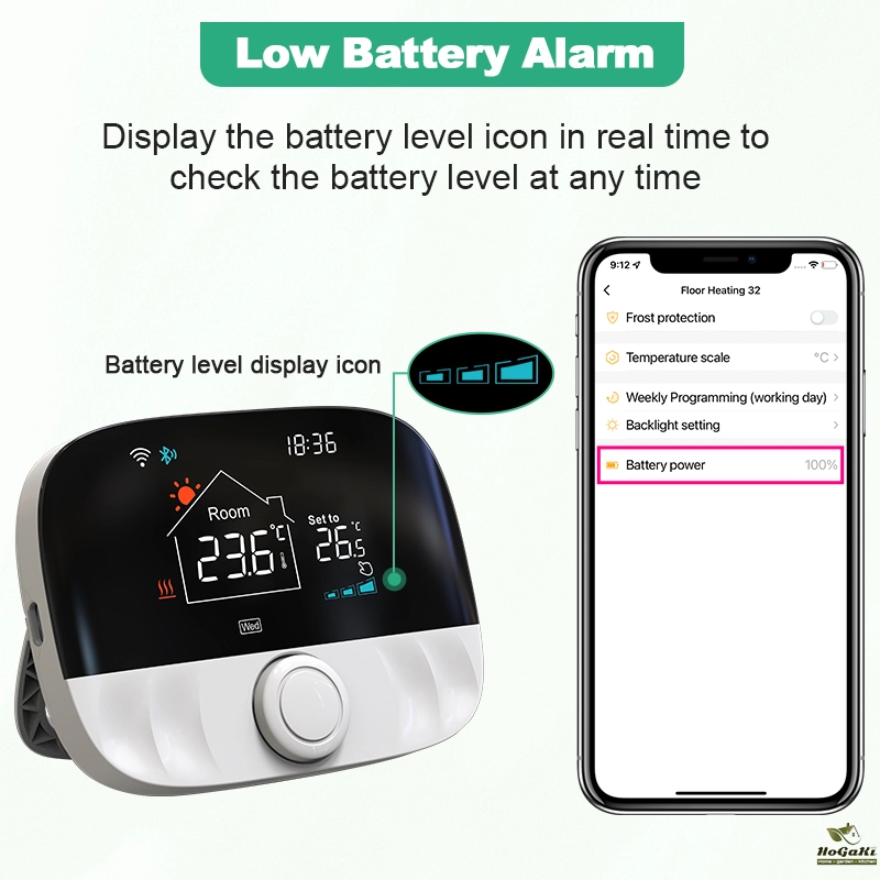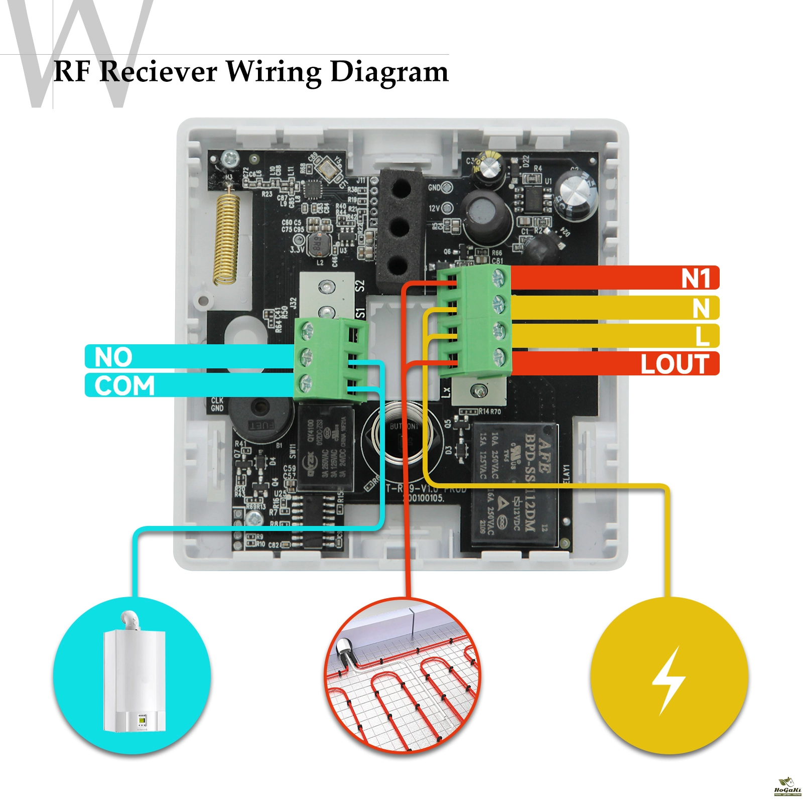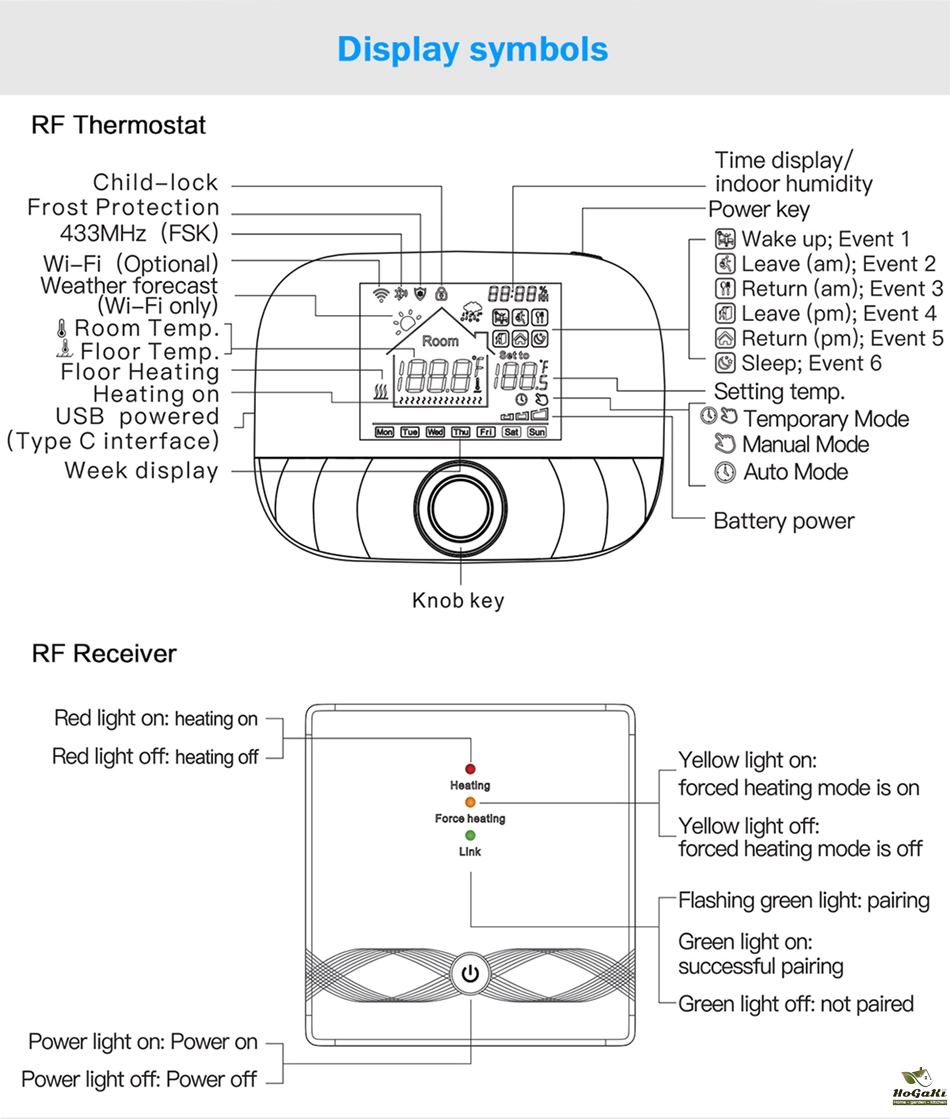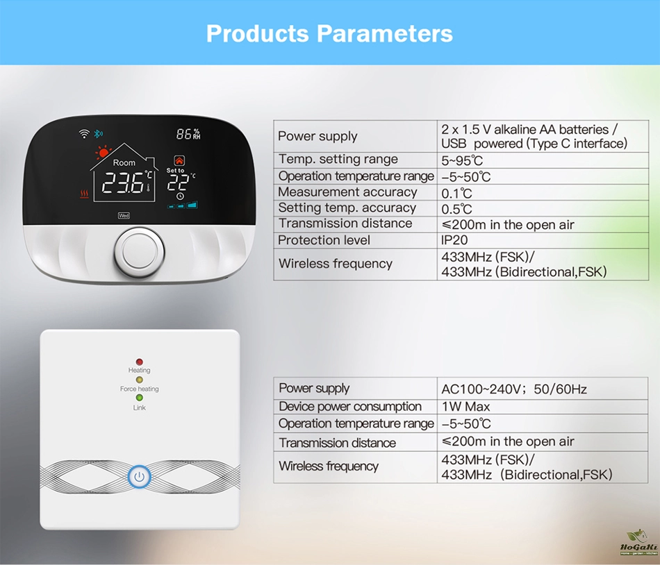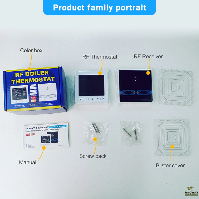 The receiver is connected to the boiler (dry contact) or electric floor heating (16A). You can place the controller in any room.Desktop Type or wall-hung Install