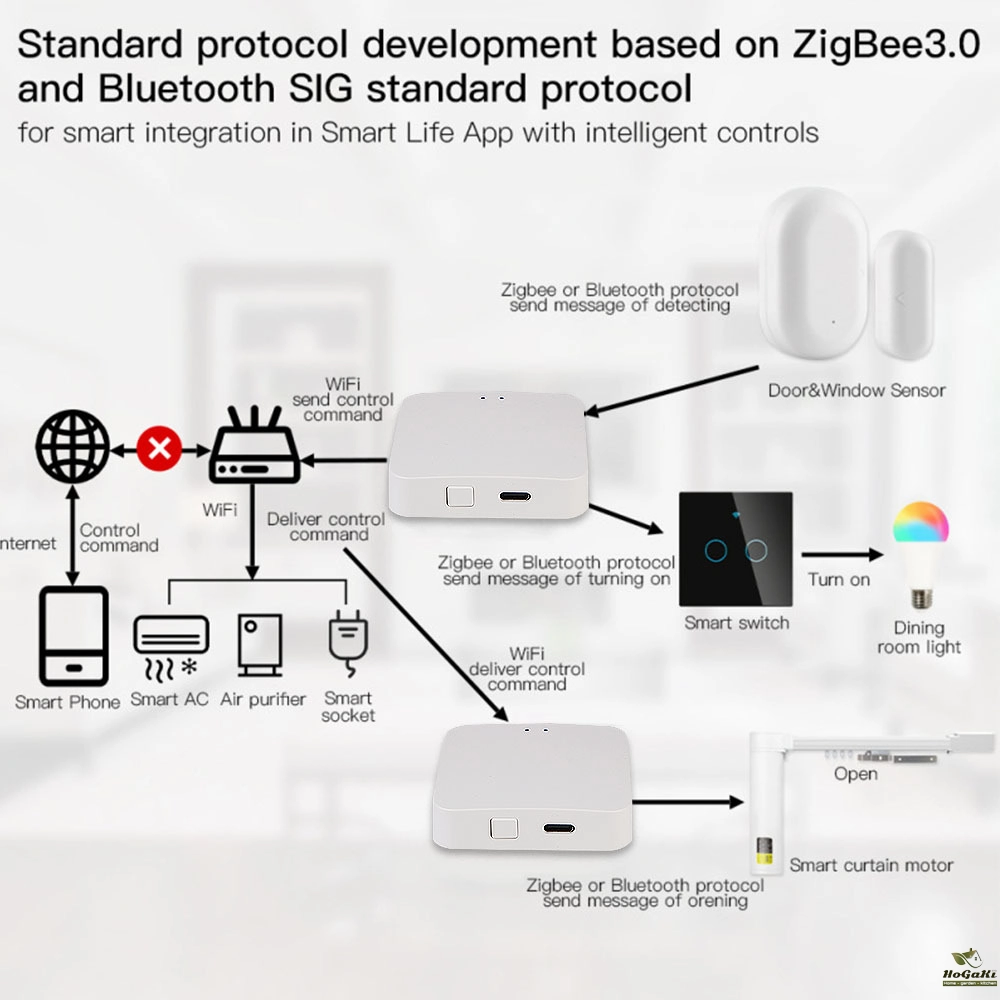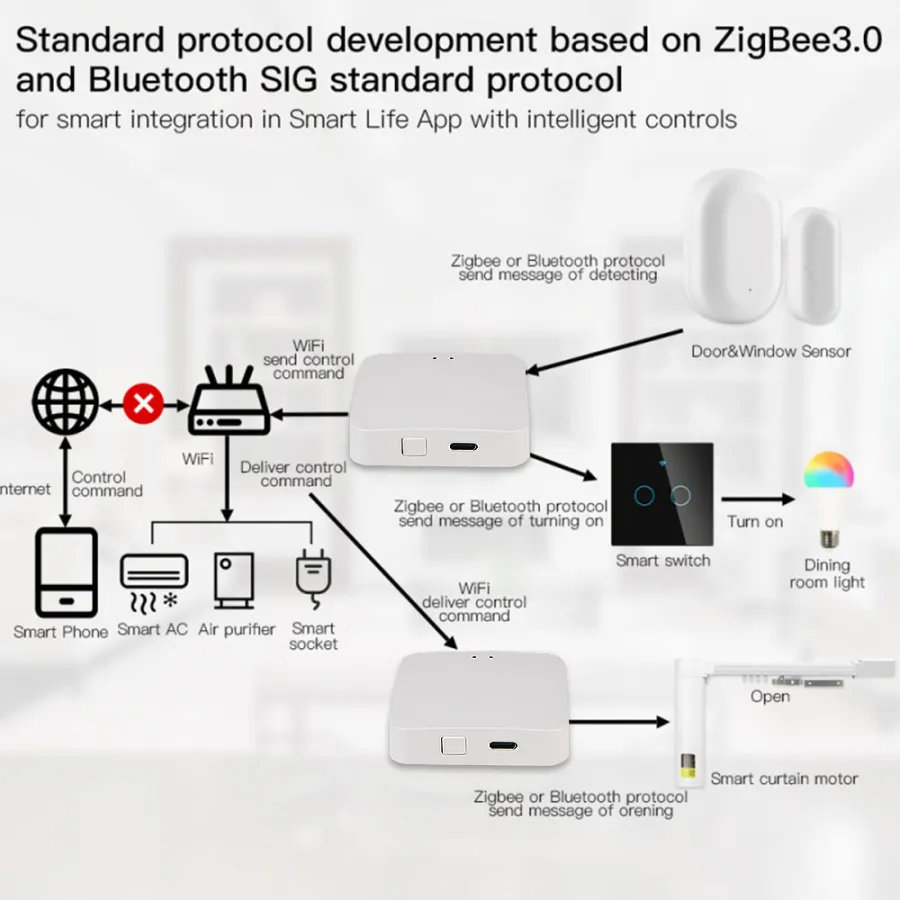 • Multi-Mode Connectivity :The Tuya multi mode ZigBee Bluetooth gateway hub supports both ZigBee and Bluetooth connections, providing seamless compatibility with a wide range of smart home devices.
