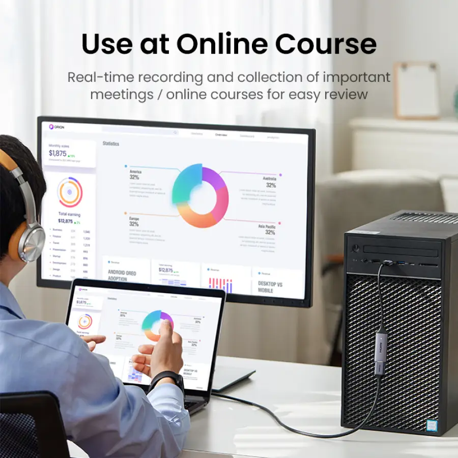 Ugreen video capture card is connected to the input device through the HDMI port, and transmitted to the output device with the USB/Type-C interface for living broadcast. It is widely used in HD acquisition, teaching recording, live streaming, medical imaging, online meetings, etc.