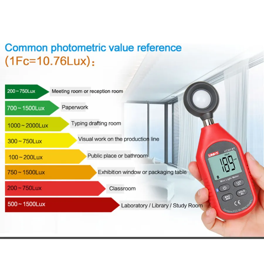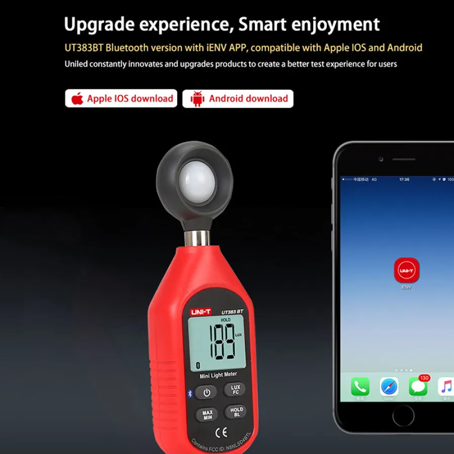 UT383/UT383BT can effectively measure light intensity and display results in units of Lux or FC on screen. UT383BT can transfer measurement data through bluetooth to UNI-T’s custom mobile APP (iENV) for further analysis, storage, and export. iENV can be downloaded from Google Play, Apple Store, or UNI-T’s website by searching ‘iENV’.