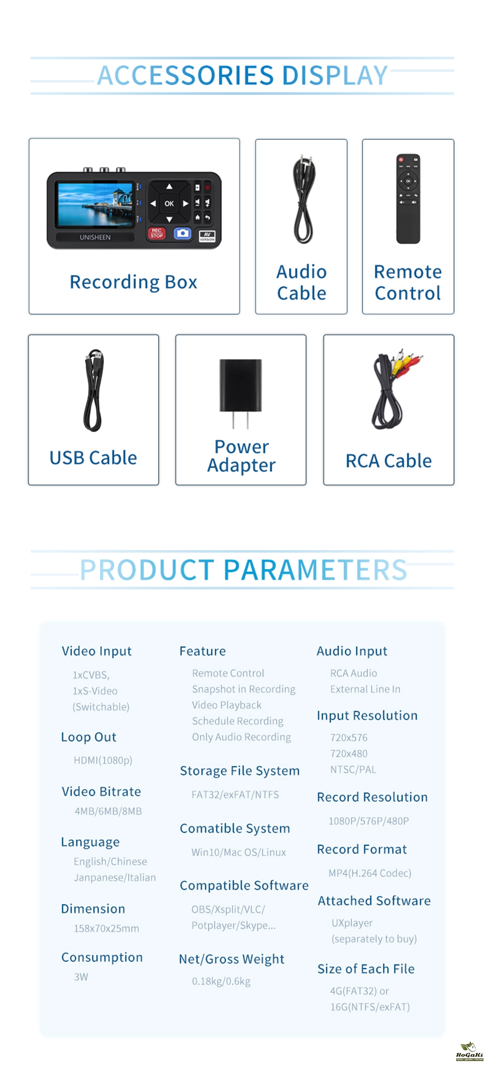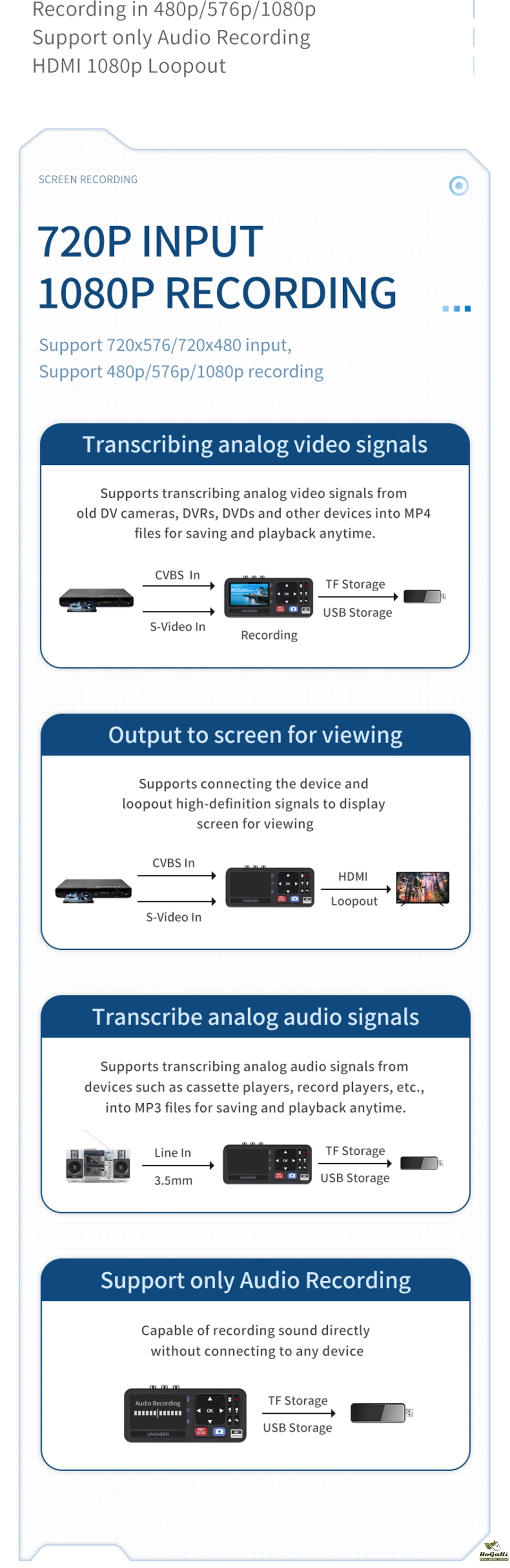 Feature | * CVBS/Svideo Input* HDMI 1080p Loopout* Recording in 480p/576/1080p* Support only Audio Recording* Support Snapshot in Recording* Schedule Recording* Flash USB Drive or TF Storage* Support Play Back* Remote Control |