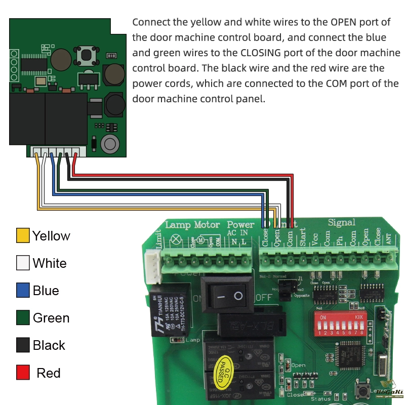 Connect the yellow and white wires to the OPEN port of the door machine control board, and connect the blue and green wires to the CLOSING port of the door machine control board. The black wire and the red wire are the power cords, which are connected to the COM port of the door machine control panel