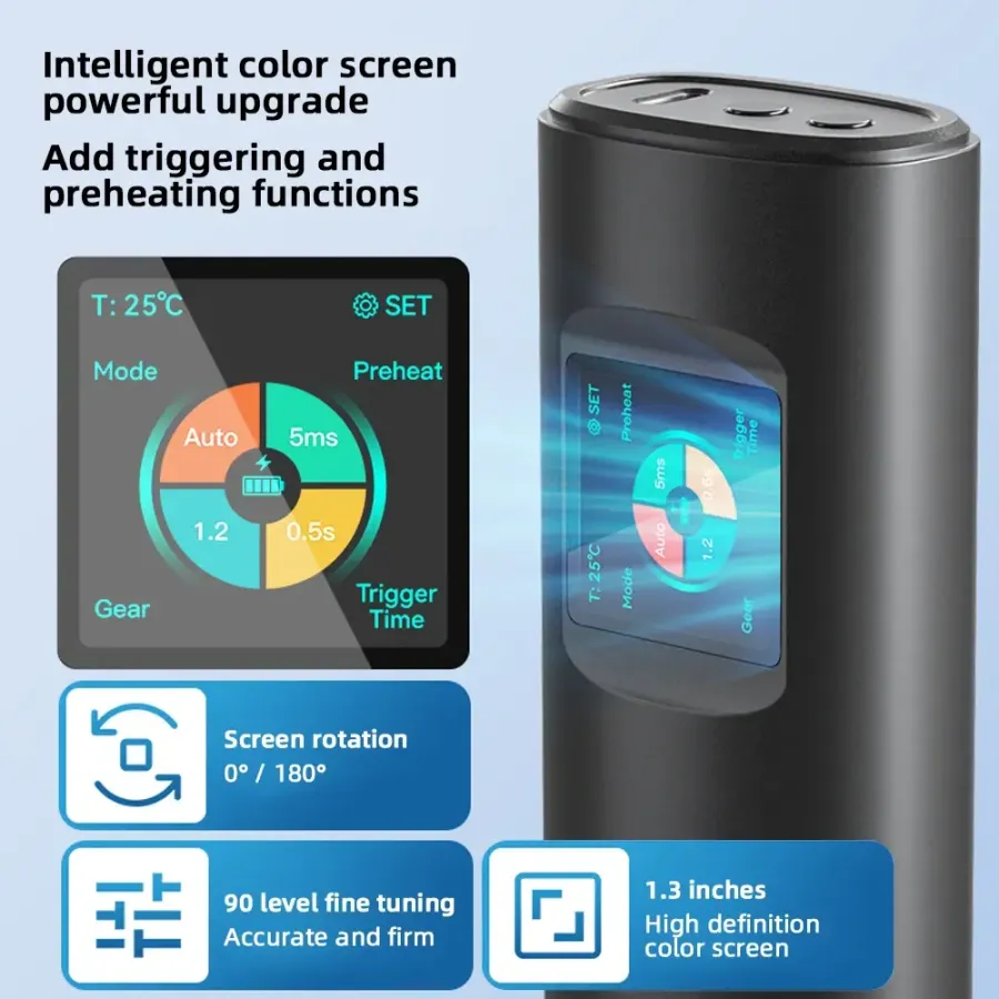 Circular LCD color screen- The spot welding machine has a 1.3-inch LCD display screen. The UI display screen presents functions with a circular dial, making circular shapes easier to distinguish. There is a protective film on the surface, which may cause scratches. Please remove the protective film.