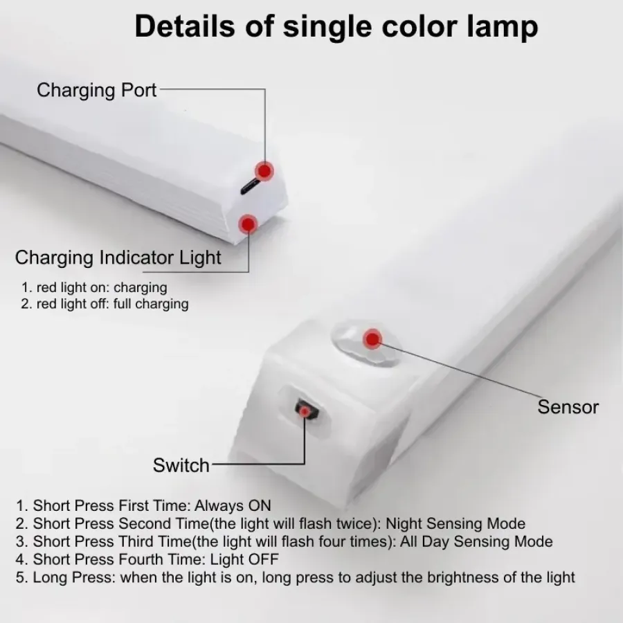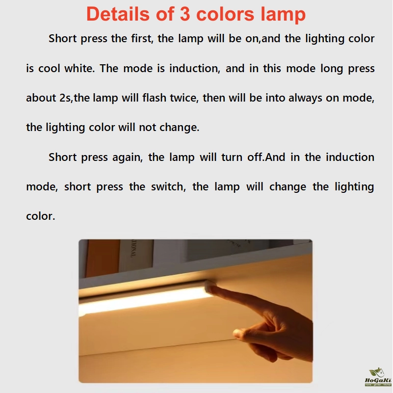 Short press the first, the lamp will be on, and the lighting color is cool white. The mode is induction, and in this mode long press about 2s,the lamp will flash twice, then will be into always on mode, the lighting color will not change. Short press again, the lamp will turn off.